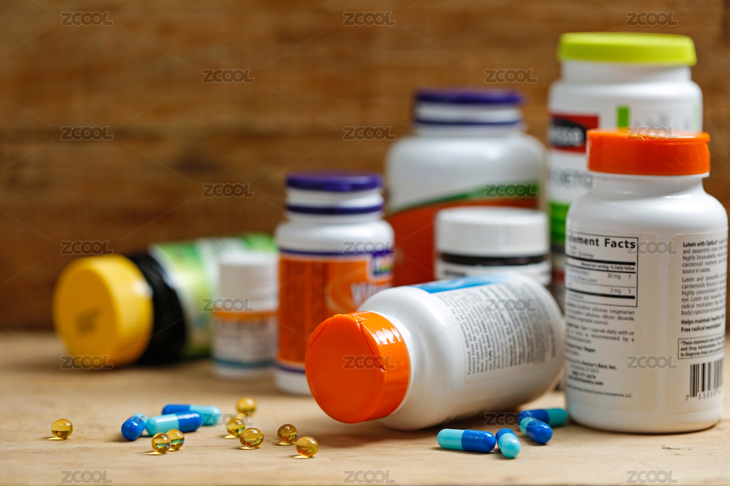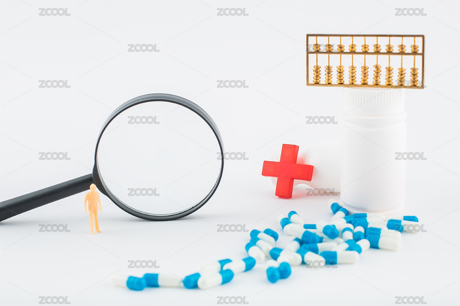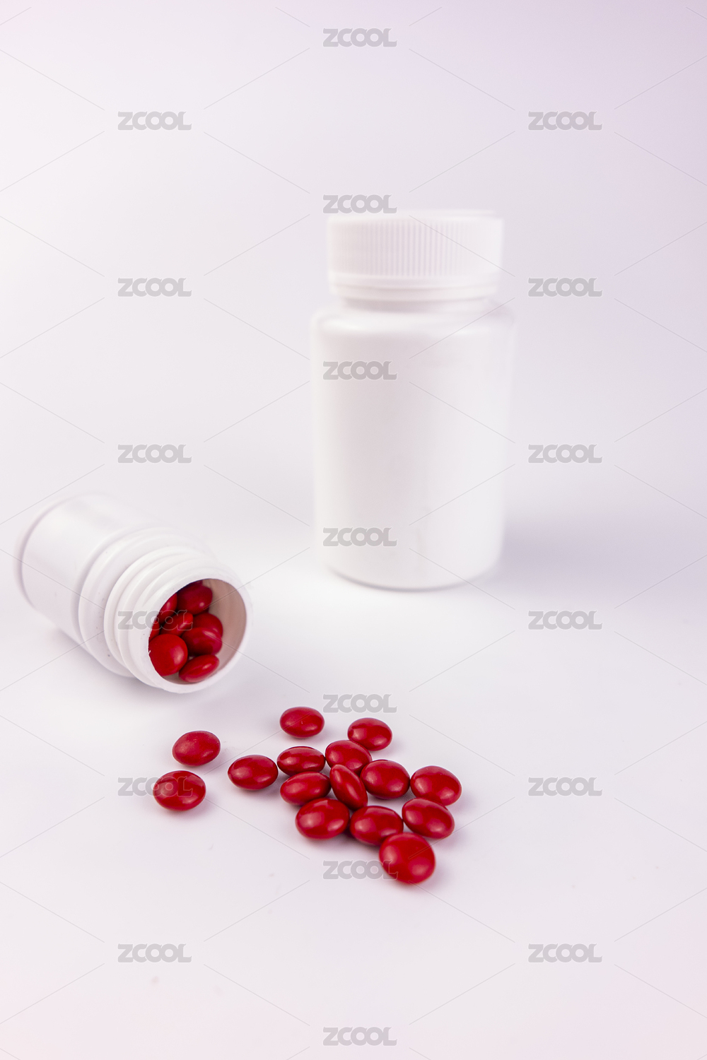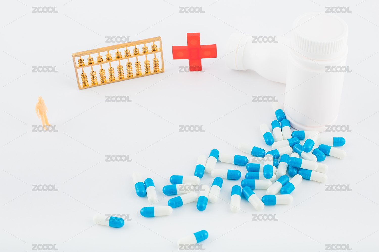 白色背景纸上放着蓝白色胶囊和白色药瓶。