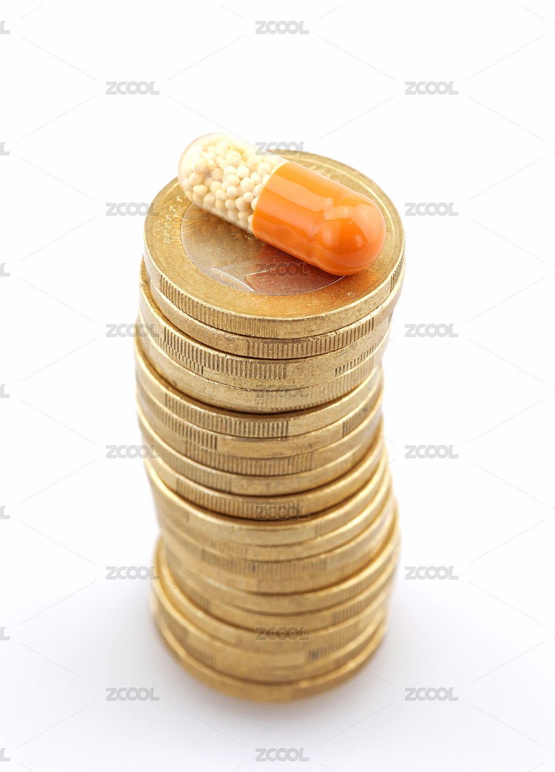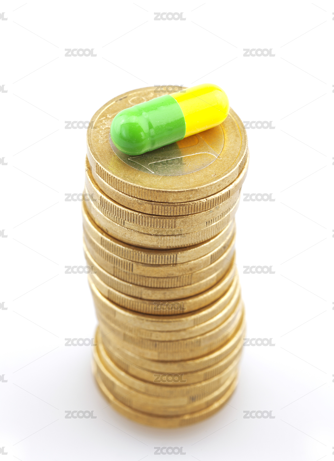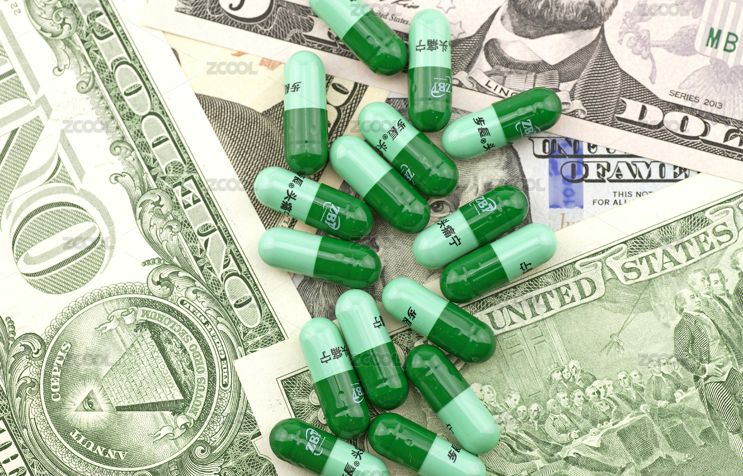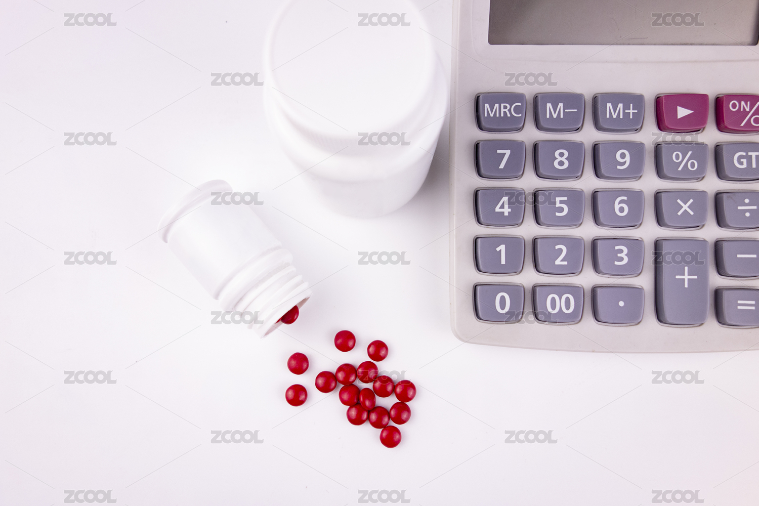 白色背景纸上放着蓝白色胶囊和白色药瓶。