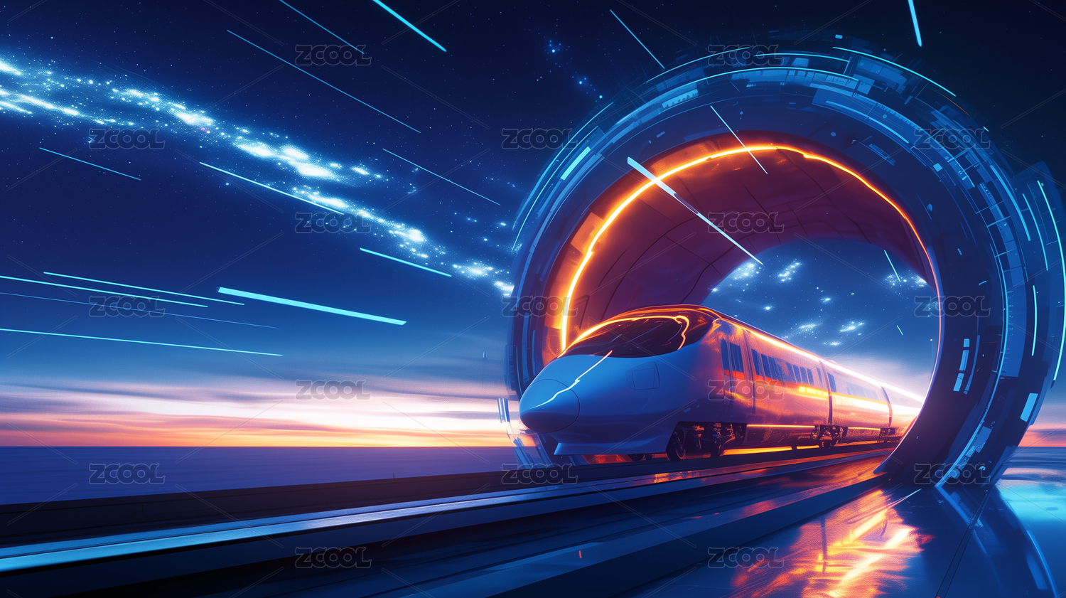 科幻磁悬浮火车高速通过磁力环赛博3D插画