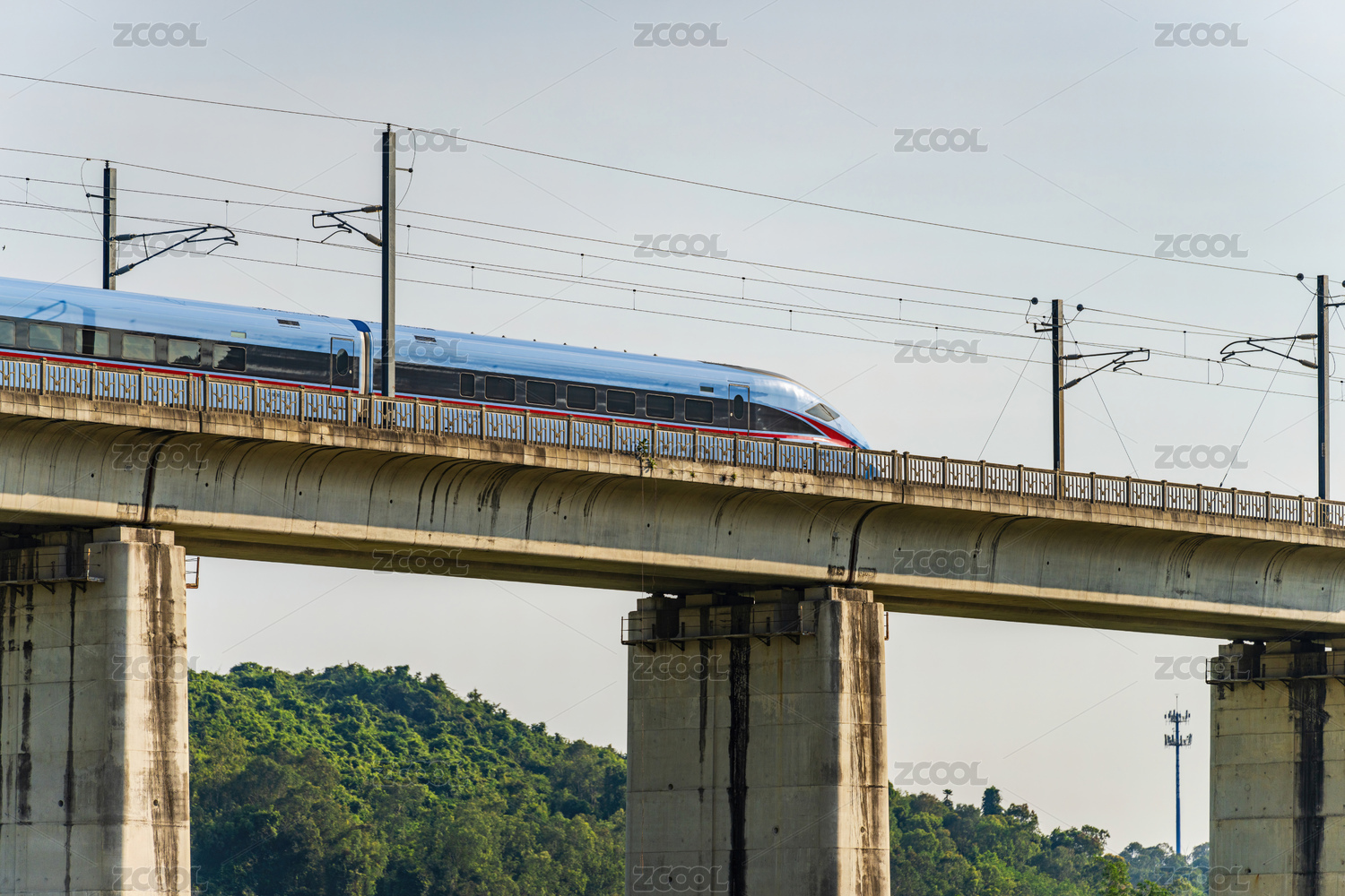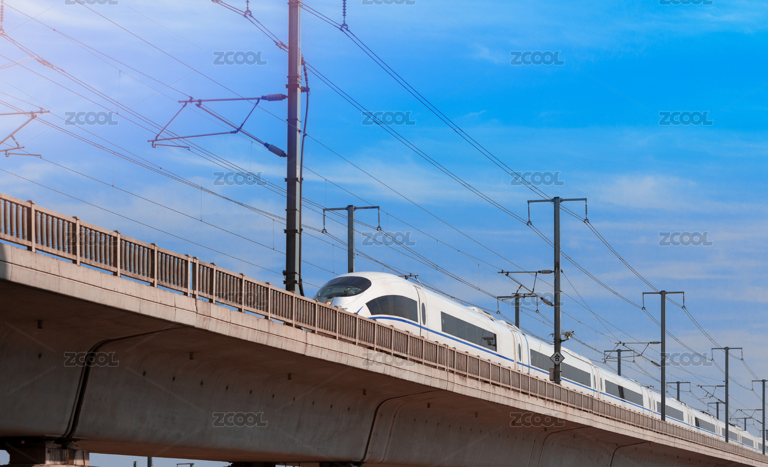 在高架桥上行驶中的高速火车和谐号高铁动车