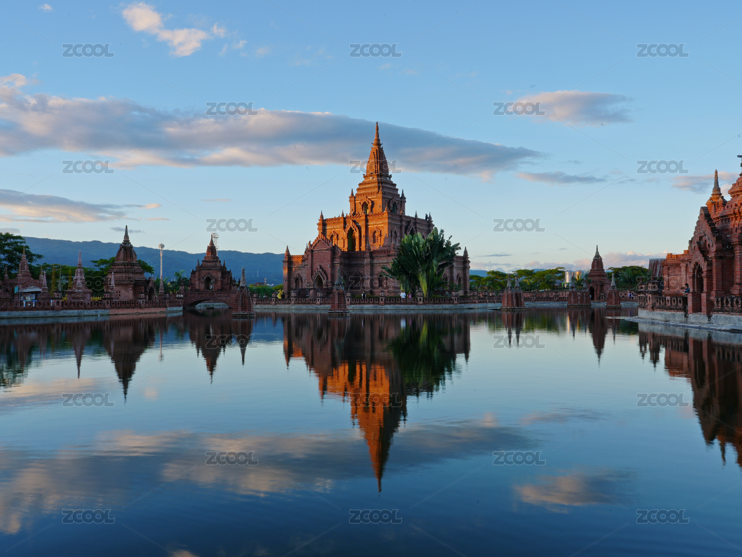 碧水蓝天下的红砖佛塔--中国云南省德宏州瑞丽市一寨两国景区