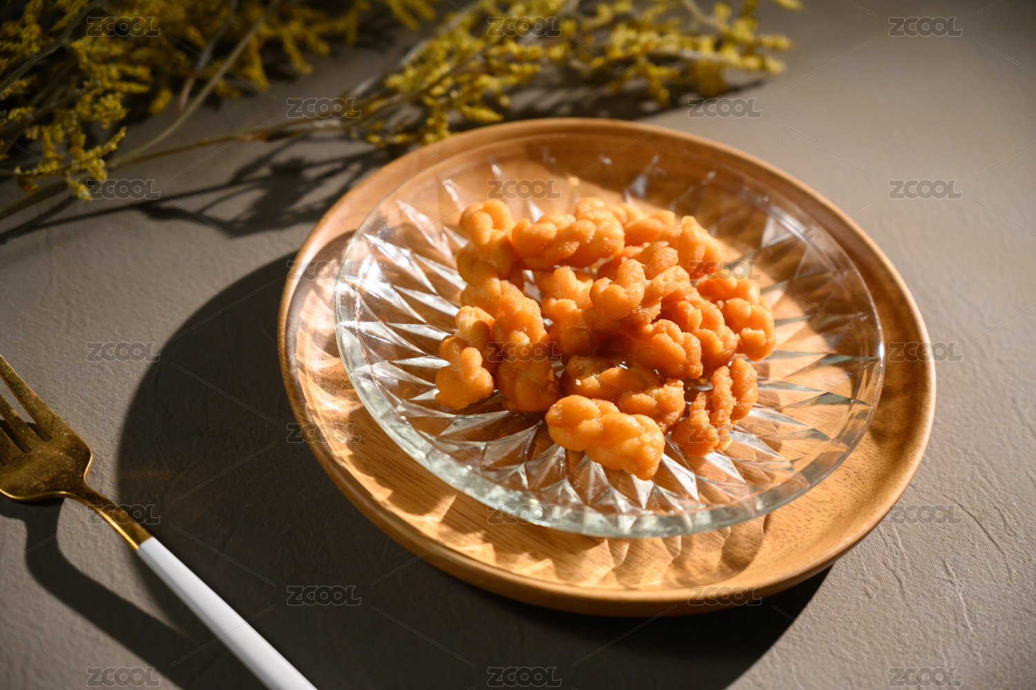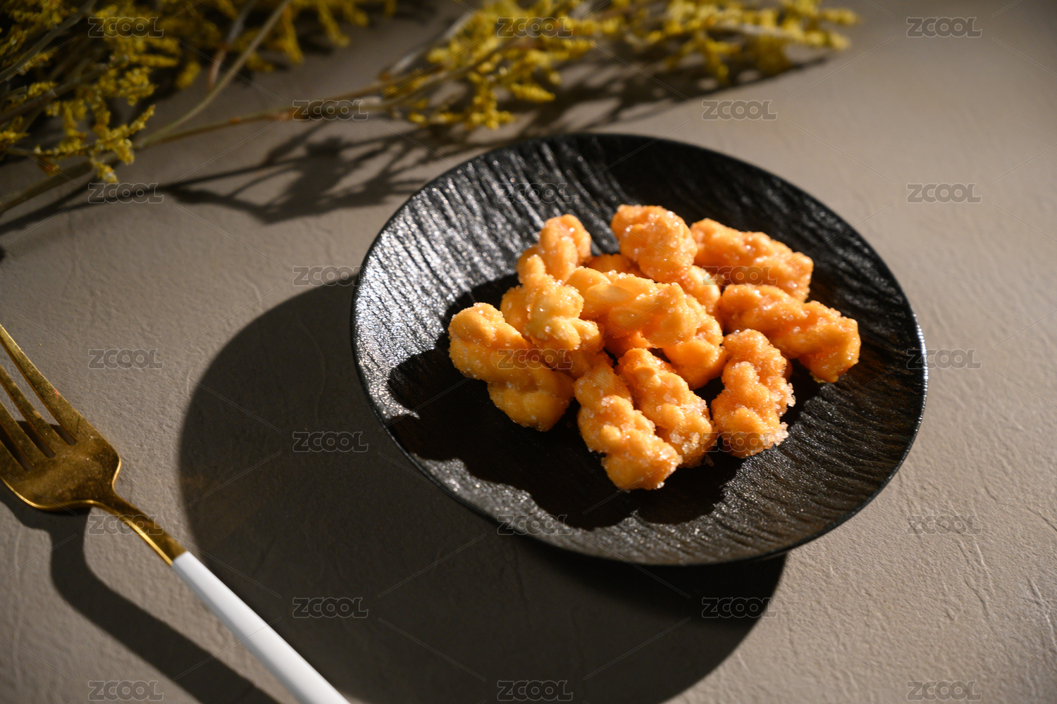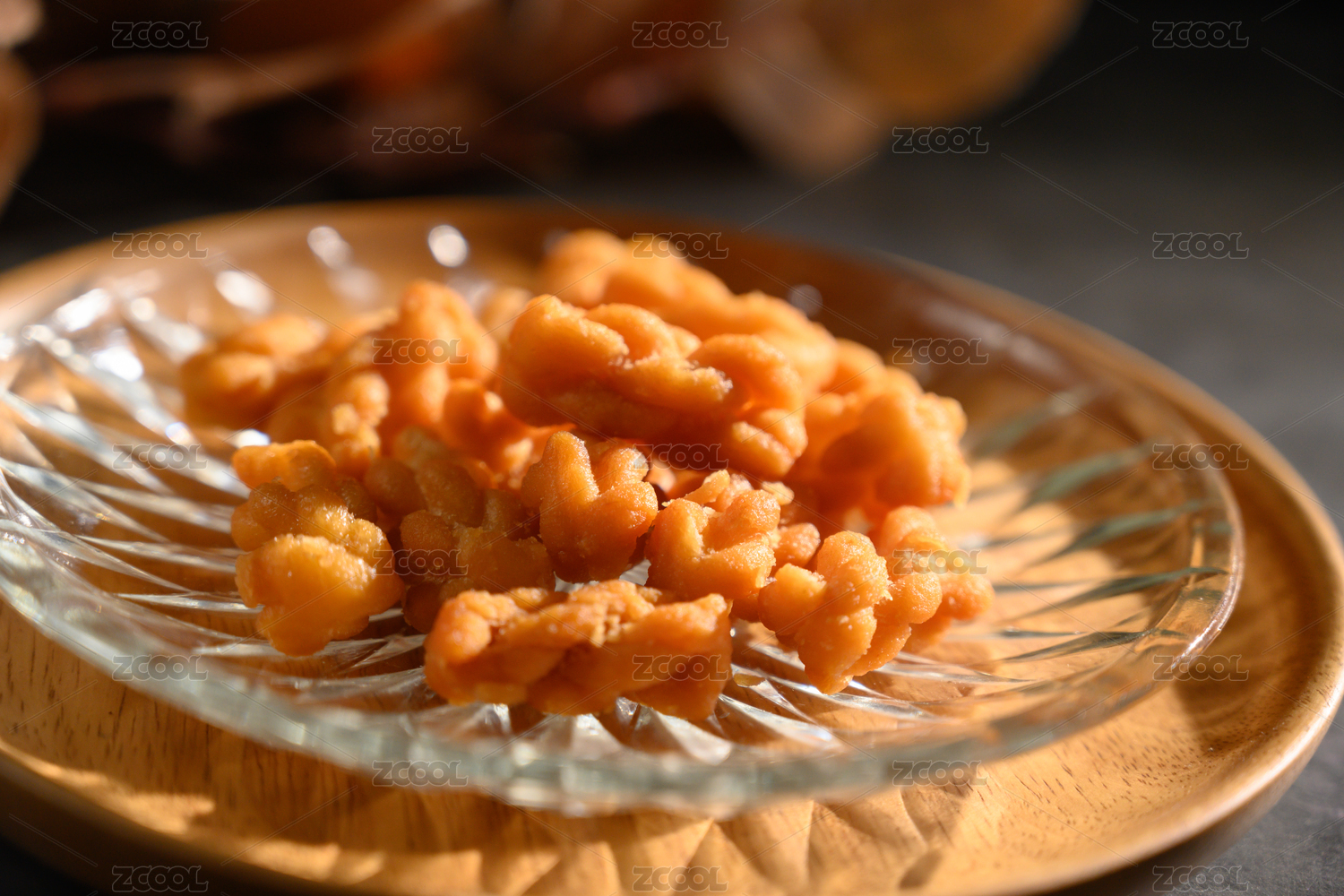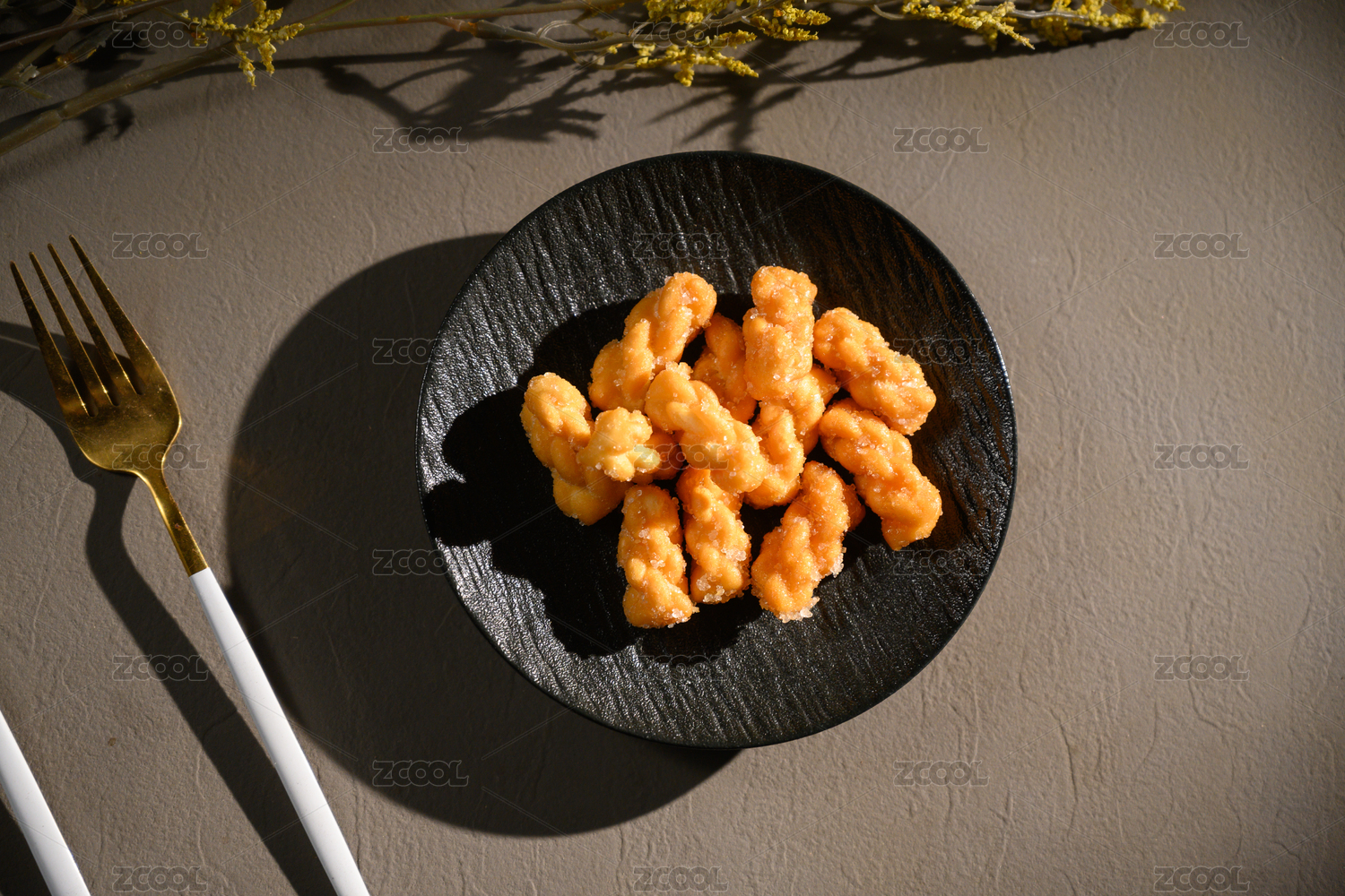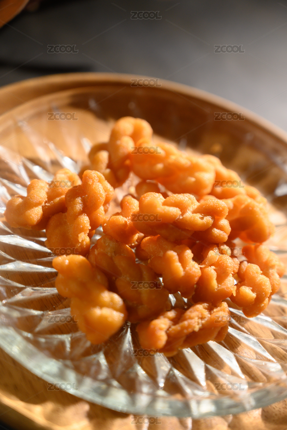 桌面上的盘子里的美味可口的糖麻花
