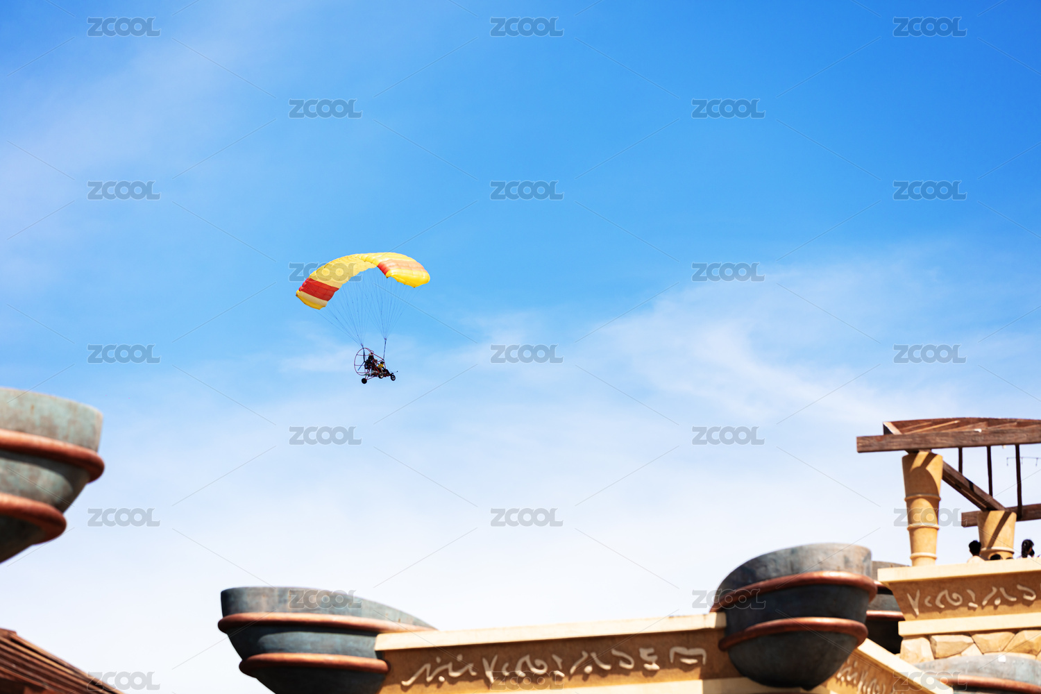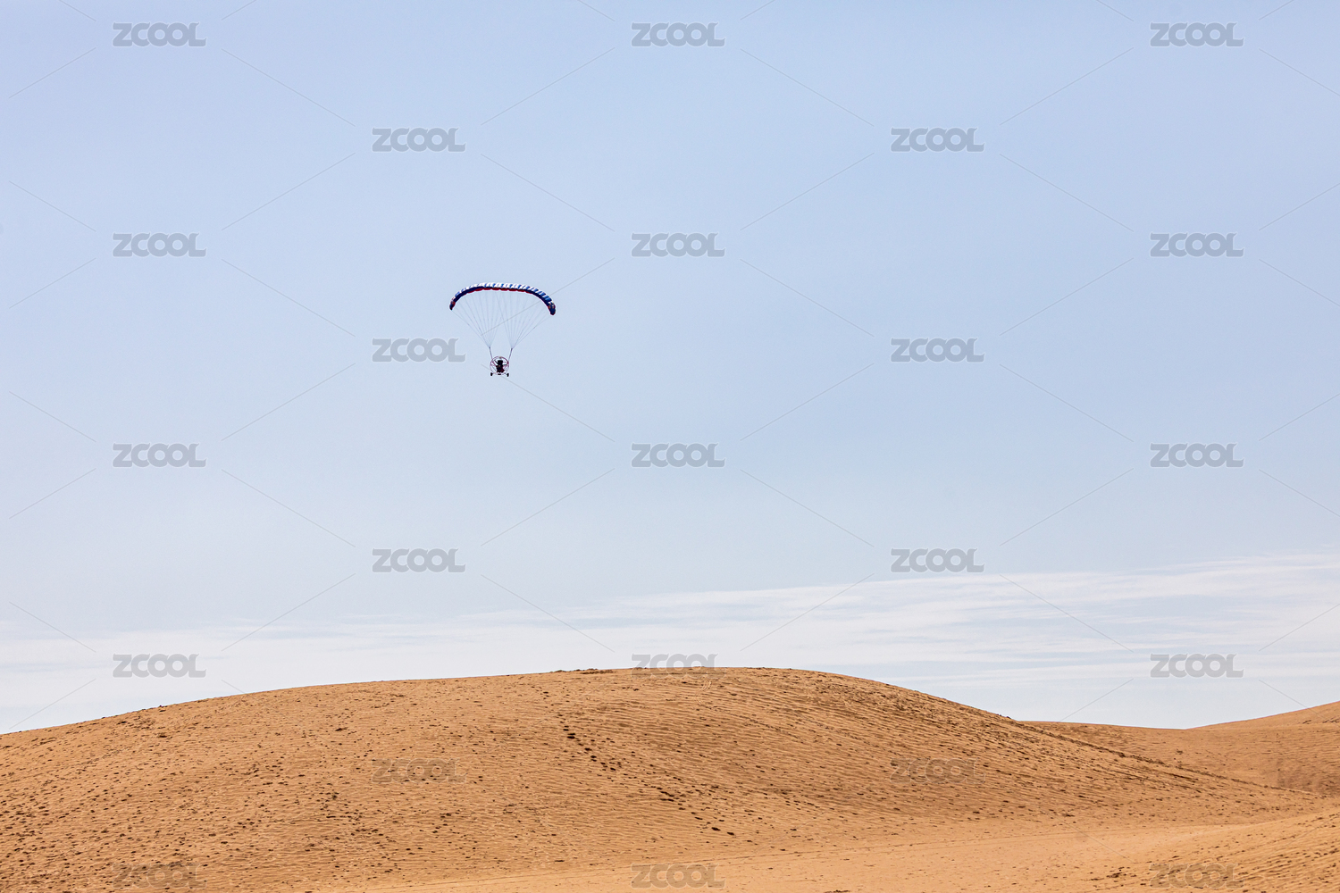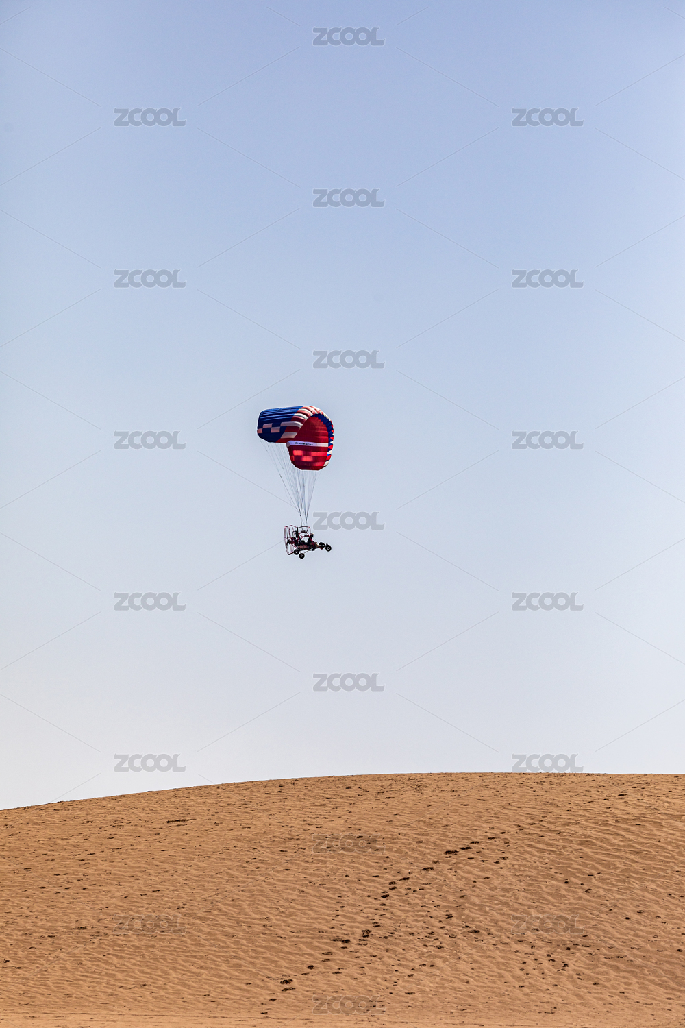 中国甘肃敦煌月牙泉景区的动力滑翔伞