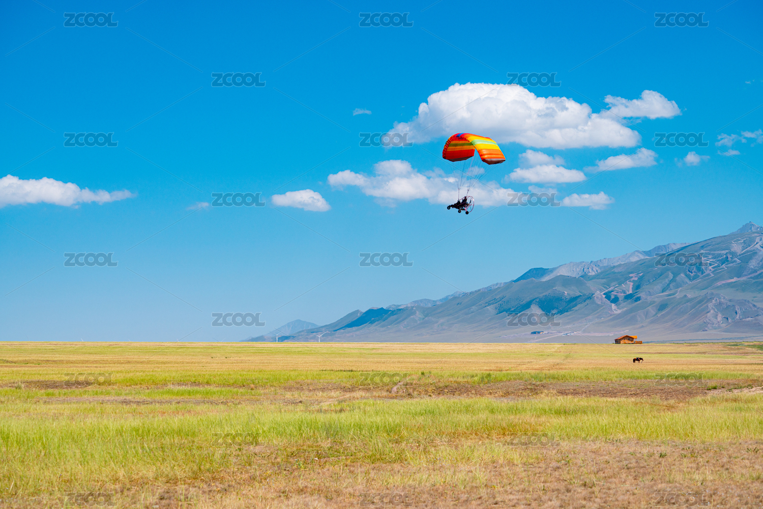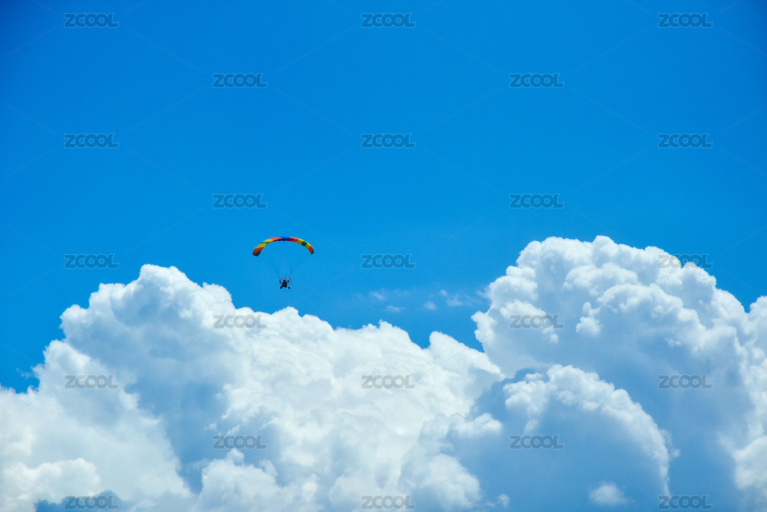 蓝天白云下的滑翔伞