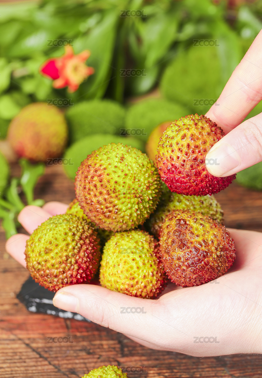 手上拿着二颗新鲜的妃子笑和妃子笑果肉