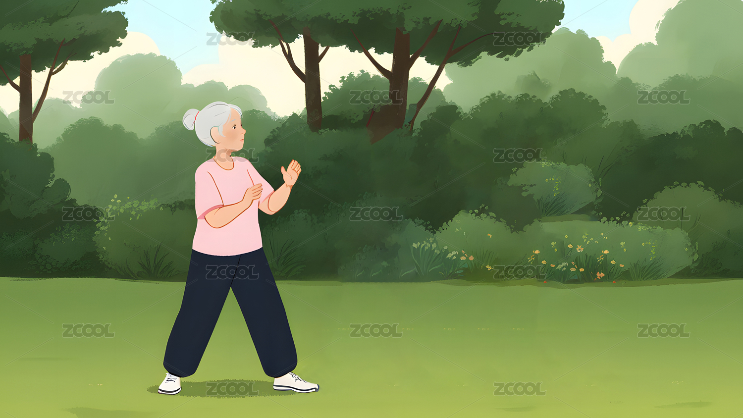 老年人在环境优美的公园里练习太极拳