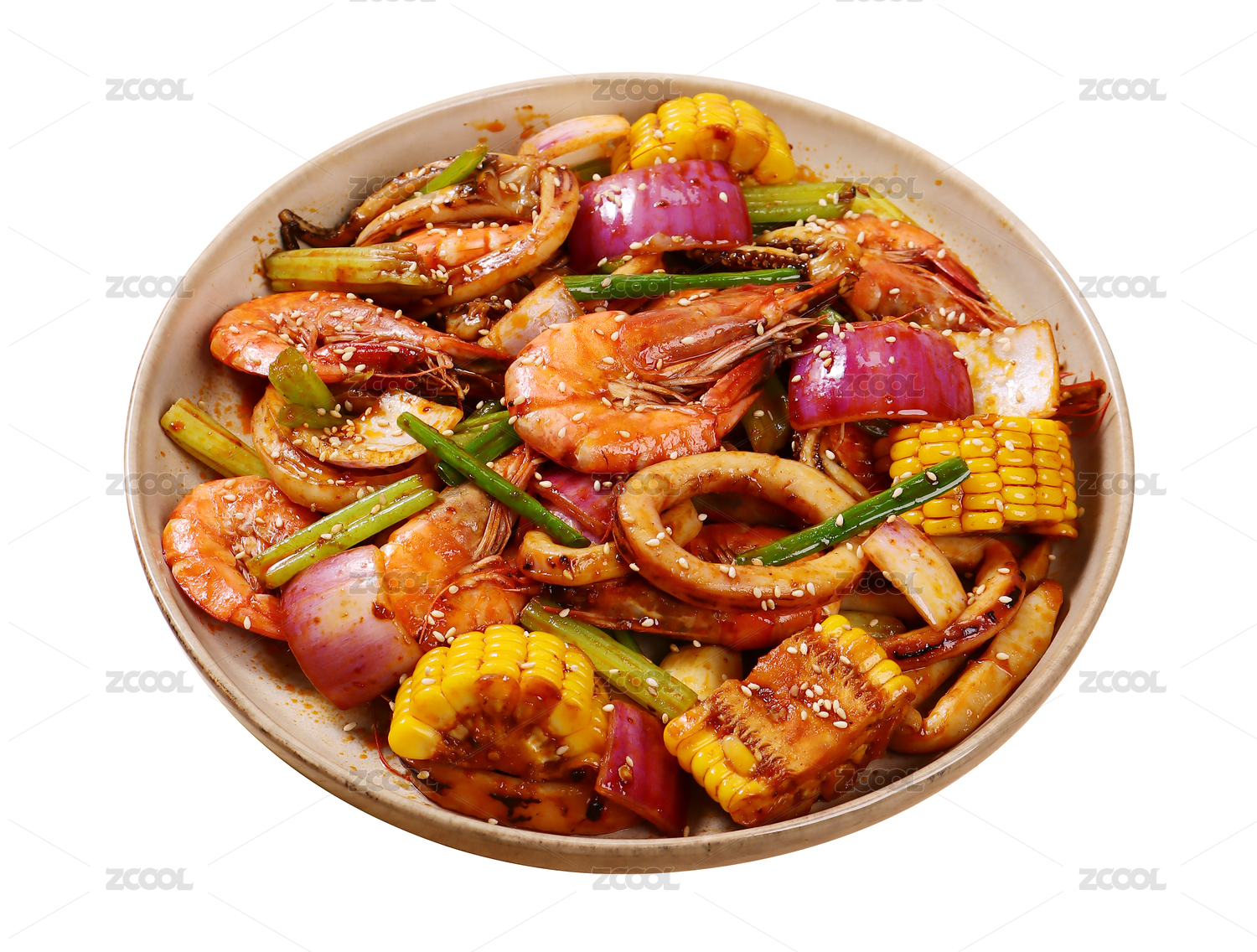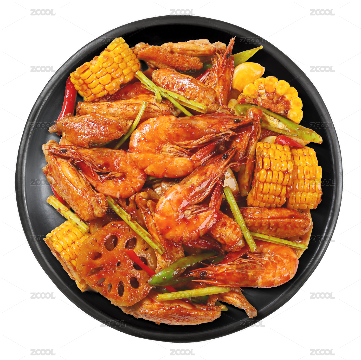 木桌上平底耳底里的麻辣干锅大虾牛蛙猪蹄
