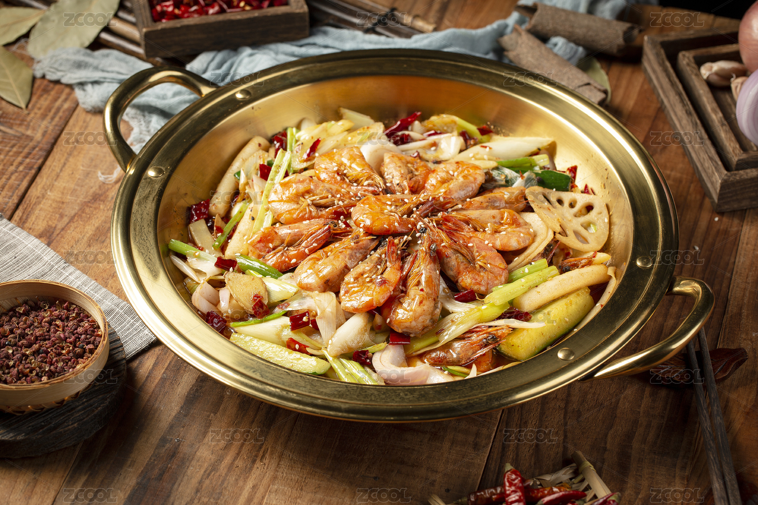 木桌上平底耳底里的麻辣干锅大虾牛蛙鸡爪
