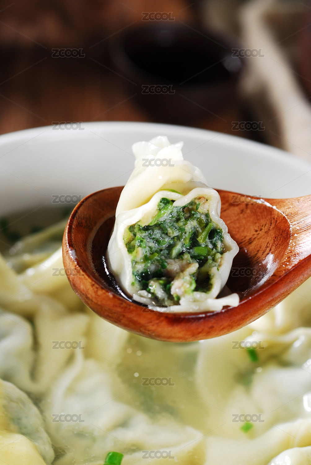 装在勺子里切开的荠菜馄饨