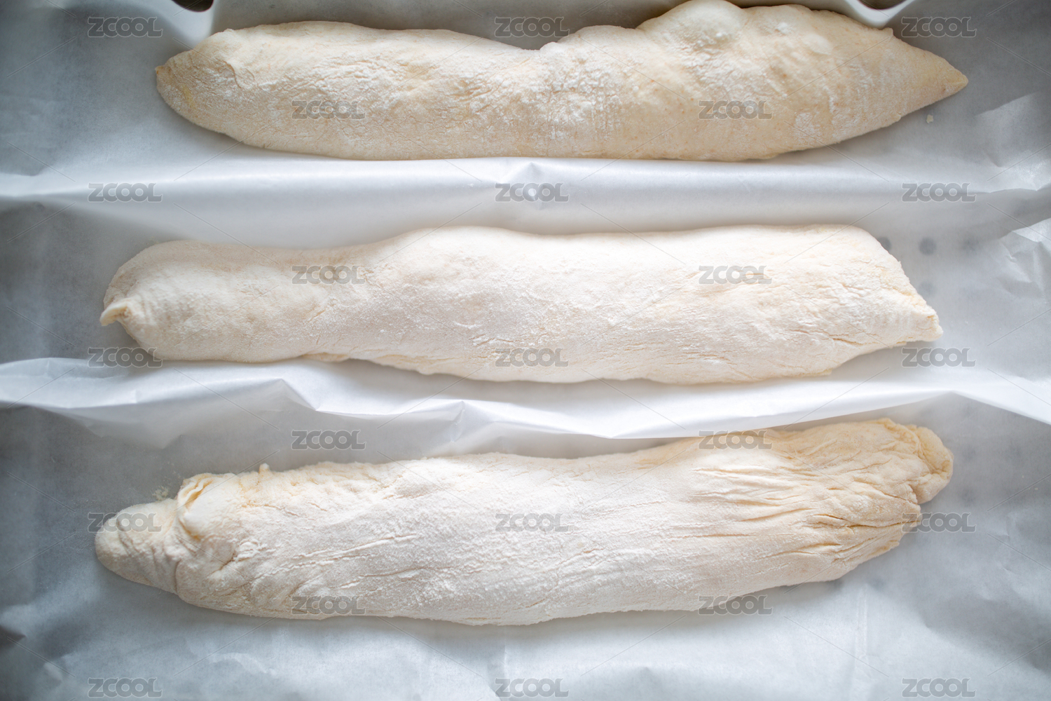 三条未烤制的法棍面团整齐排列在烘焙纸上