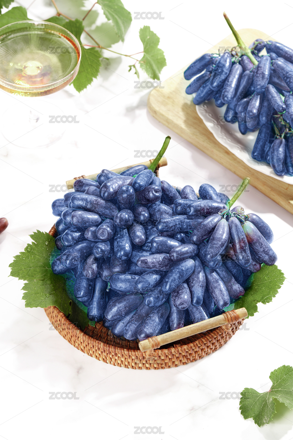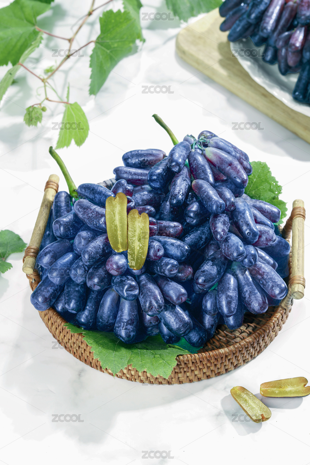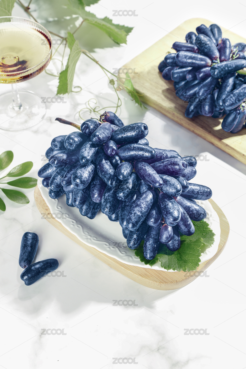 放在杯子上的一串饱满熟透的金手指黑提葡萄