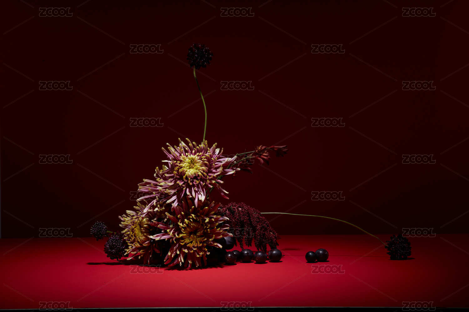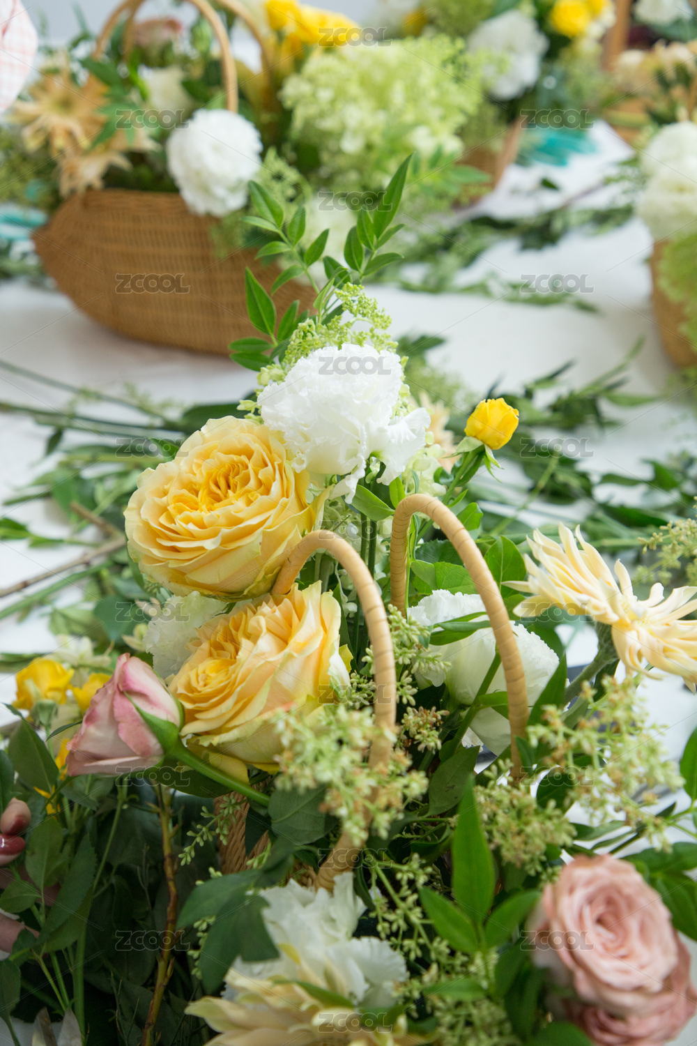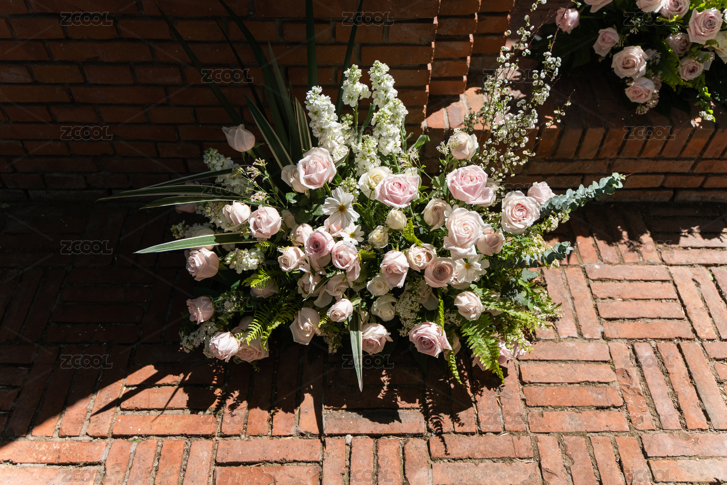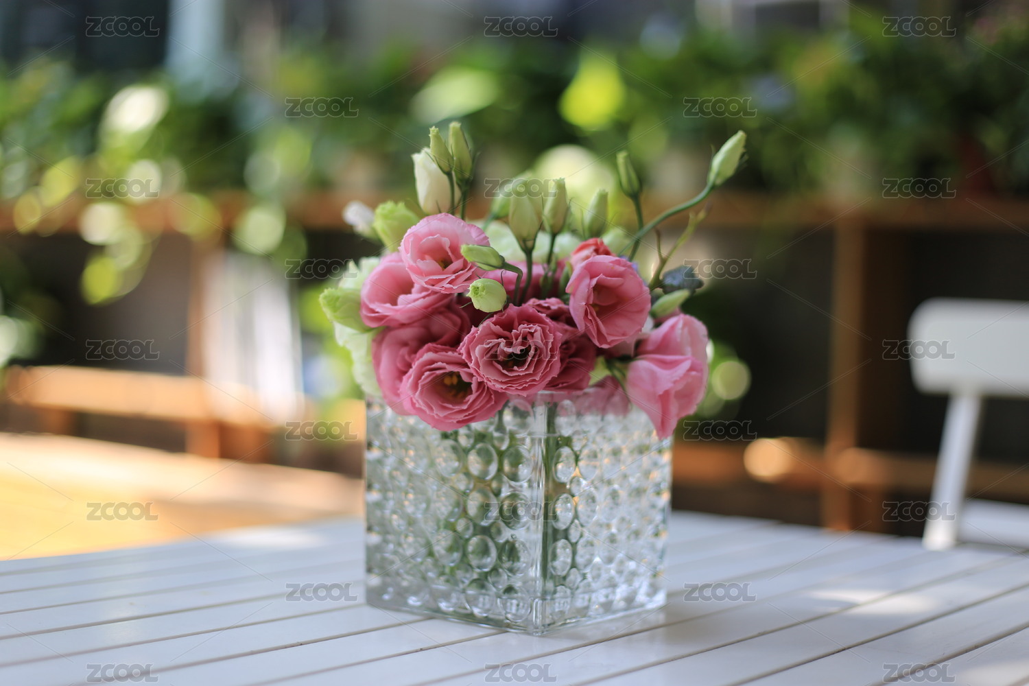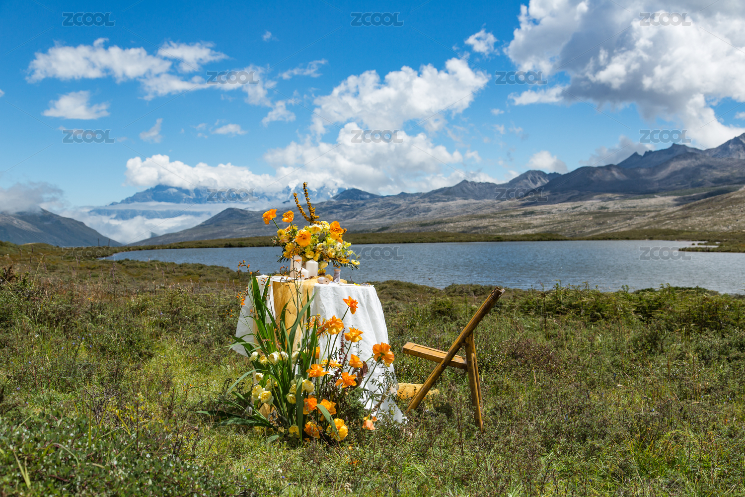中国四川甘孜康巴地区海子边布置花艺的桌椅