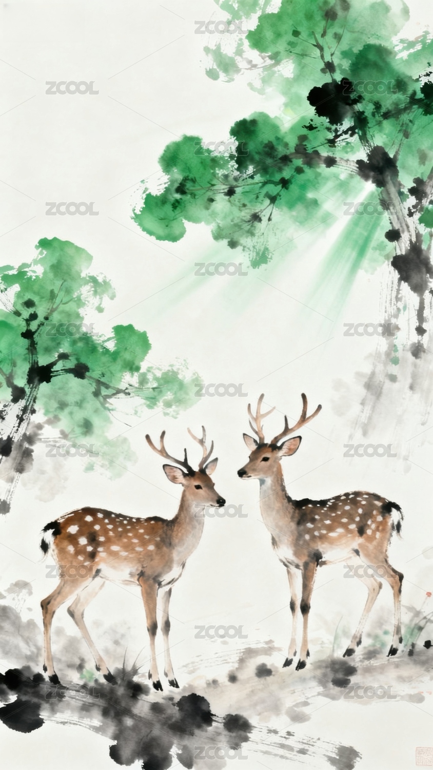 双鹿林间水墨画