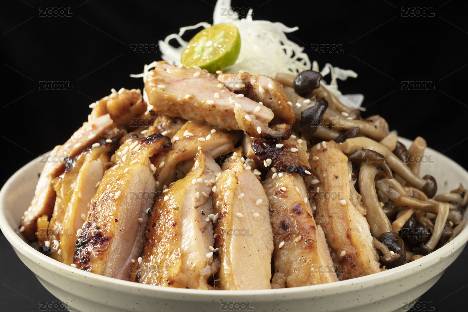 日式碗里的料理香煎烤鸡肉配茶树菇套餐