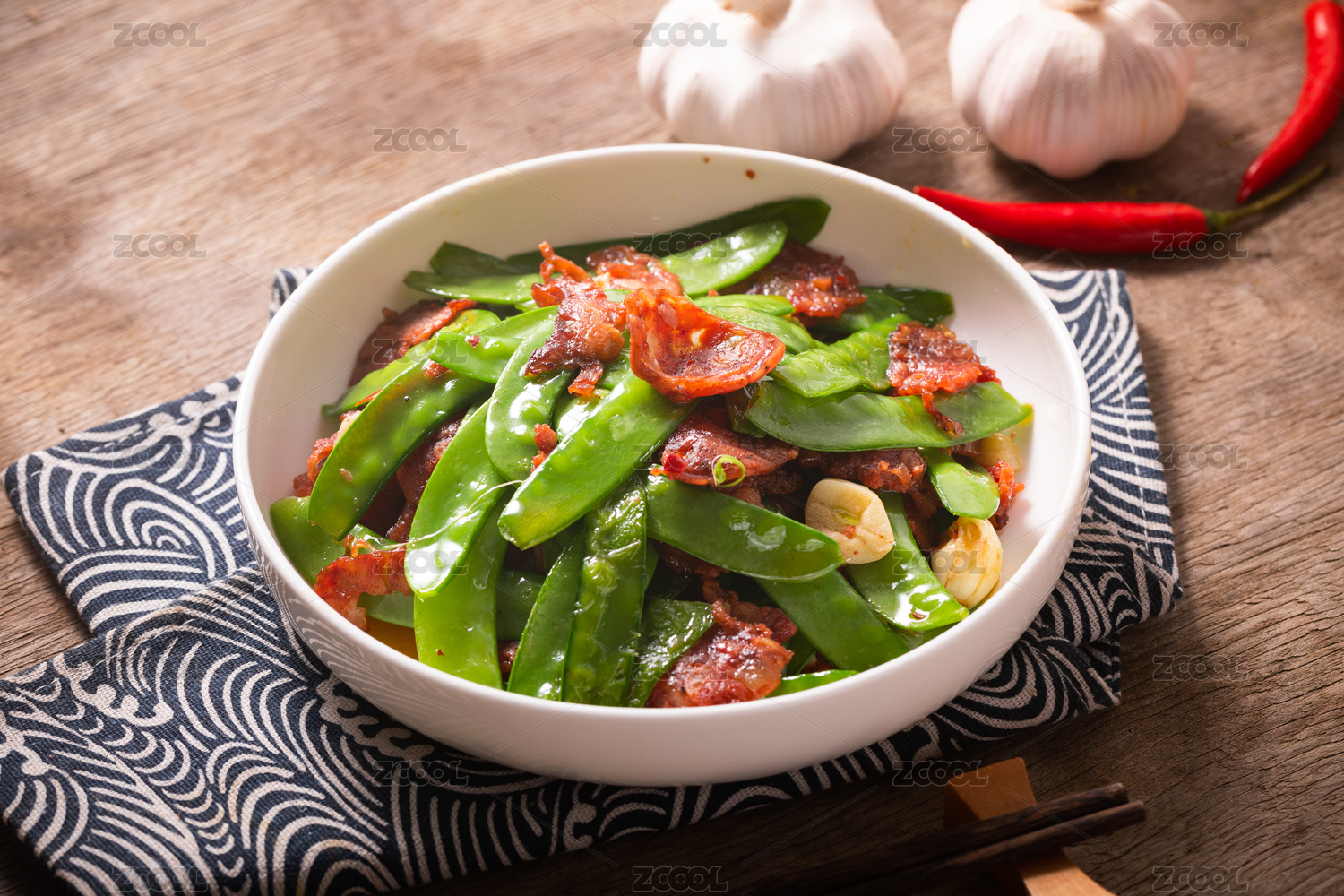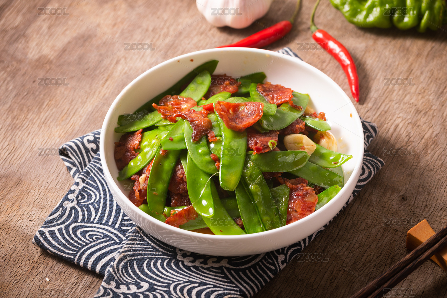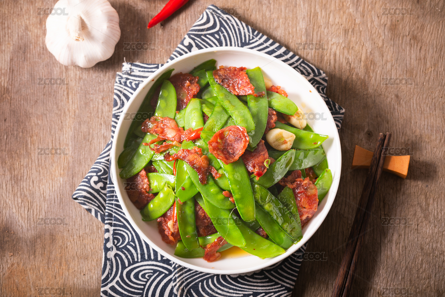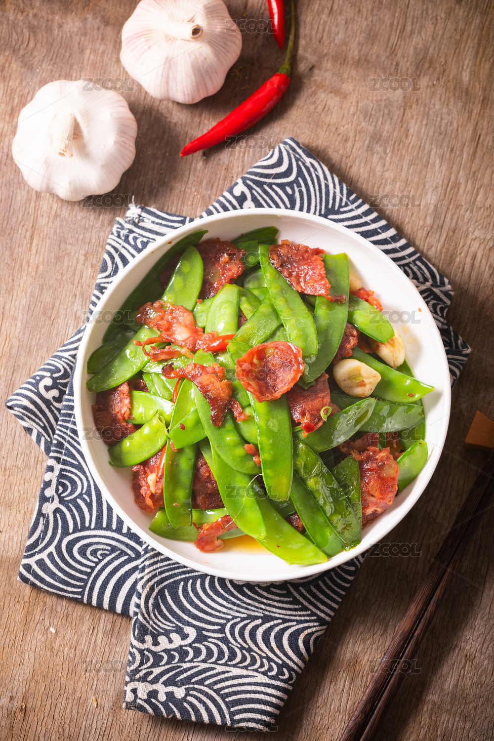 大理石纹桌面上有一份荷兰豆炒腊肠