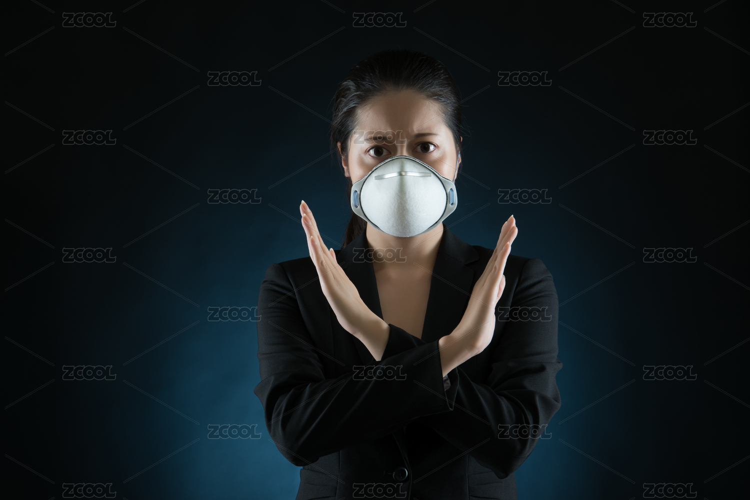 亚洲女子穿面罩的感觉污染生病。与手势的手说没有。年轻多种族亚洲中国女模特