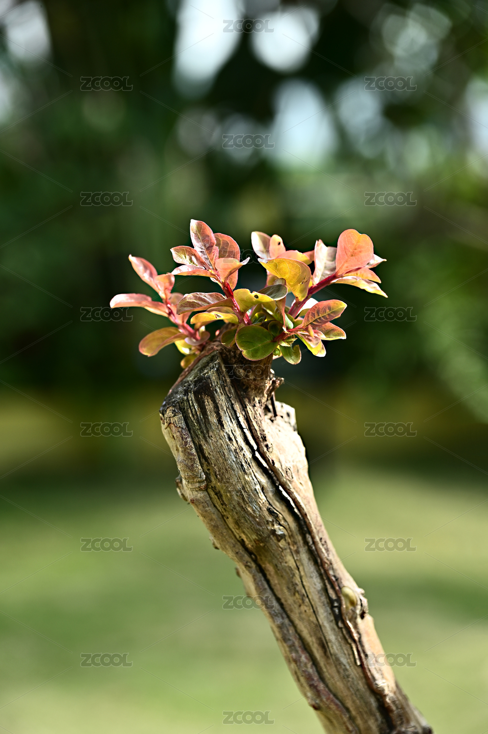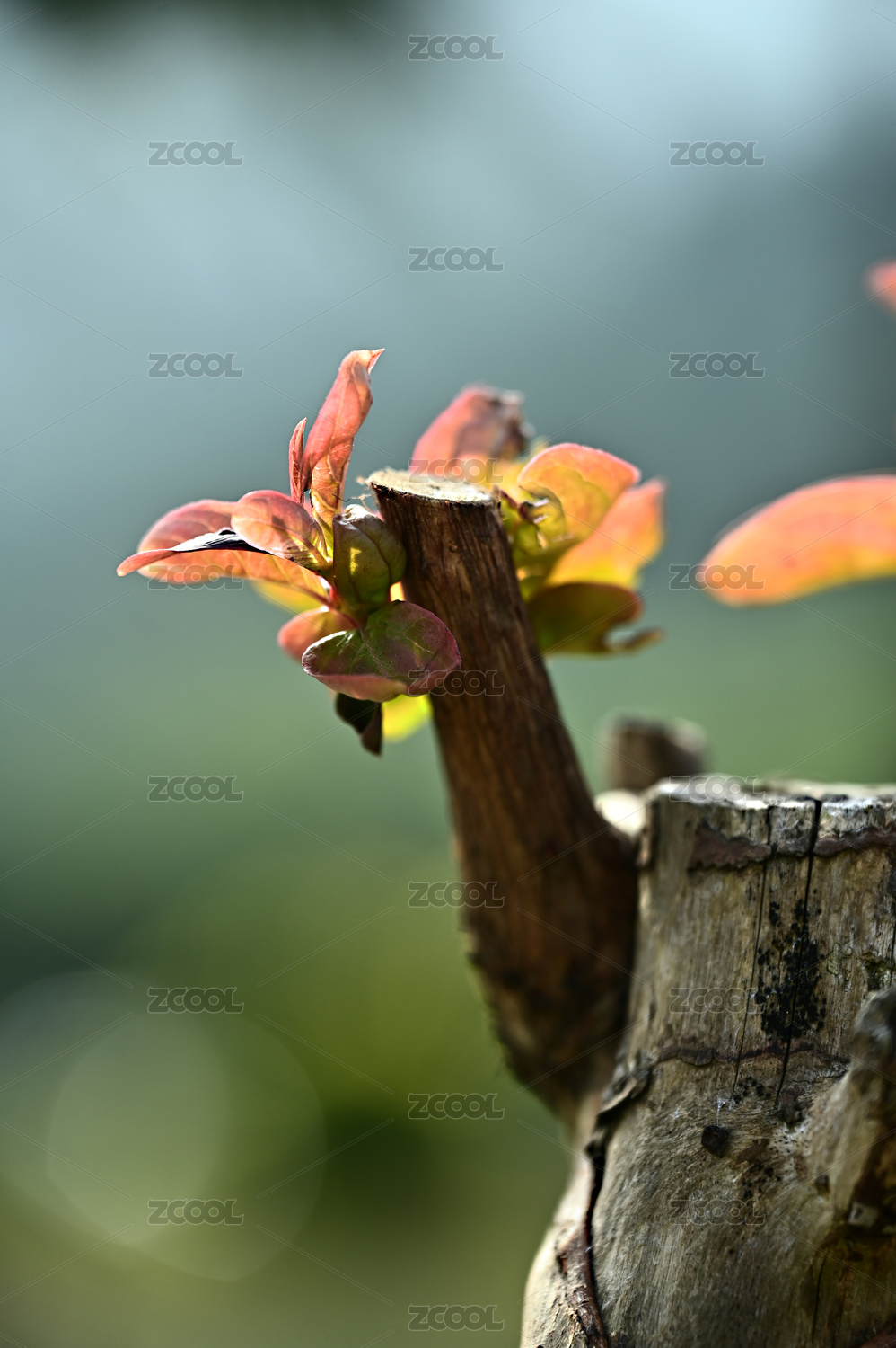阳光下紫薇老树新芽