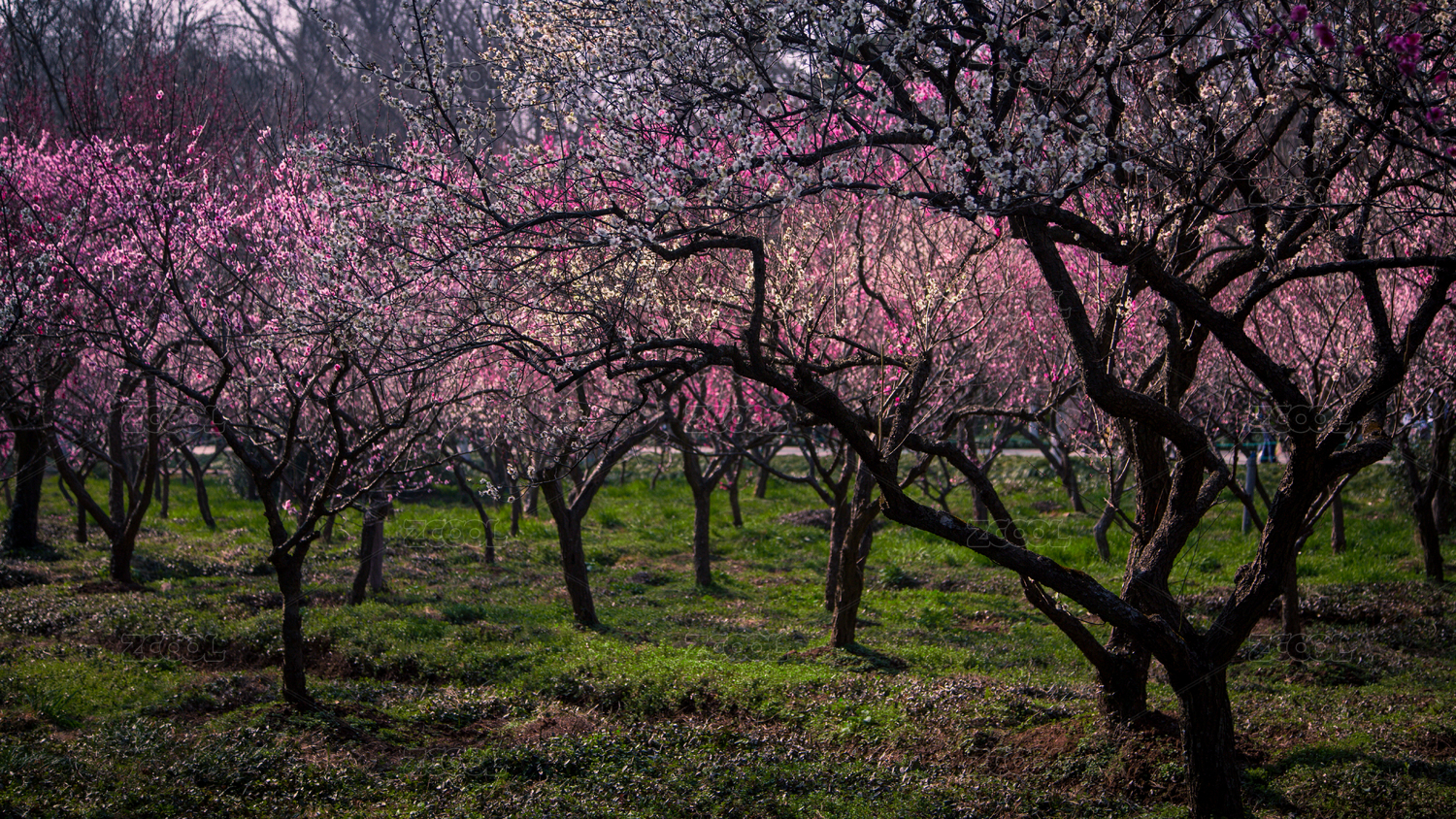 早春盛开的老桩粉红色梅花