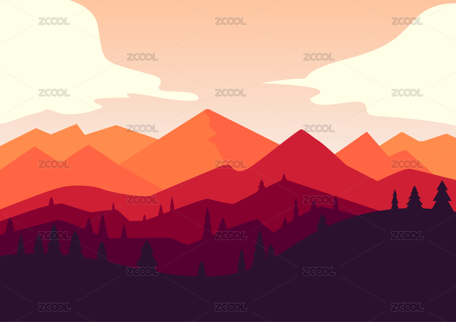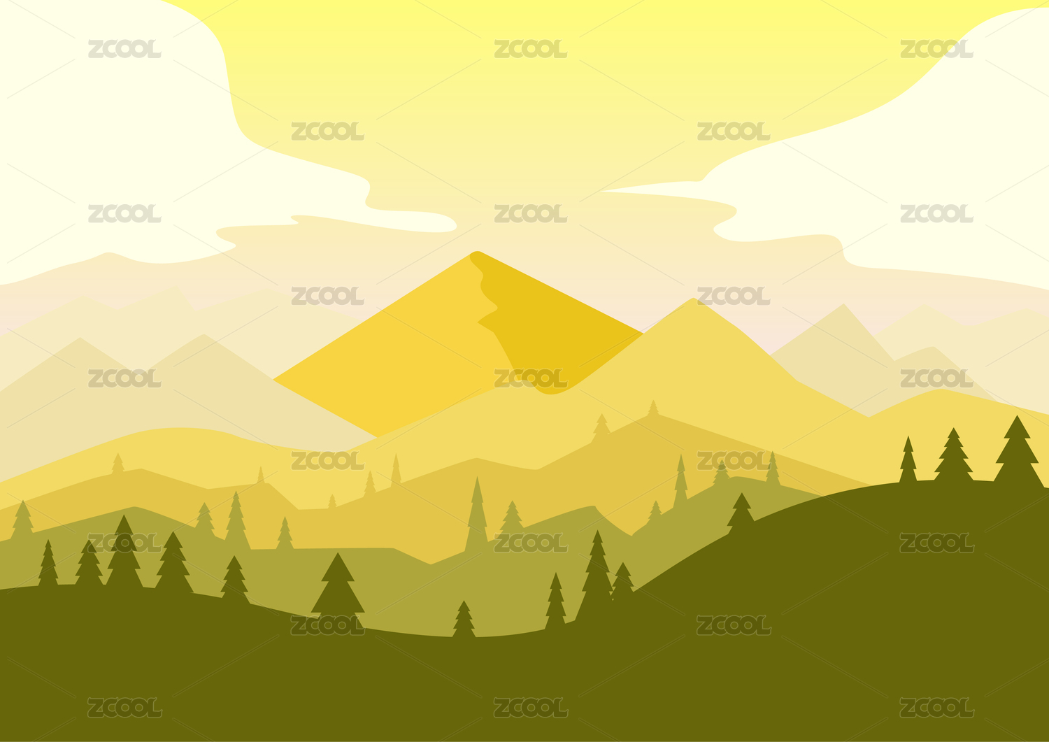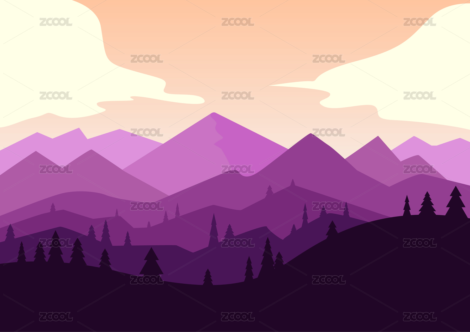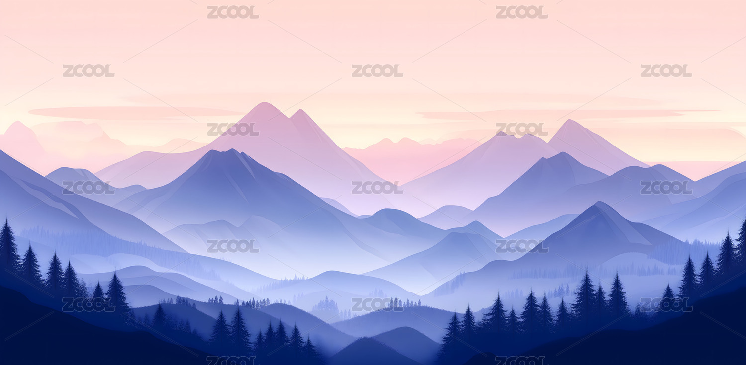 早晨渐变色的小森林有几只小鸟飞过,一条发出淡淡光彩的河流在缓缓流动插画背景海报