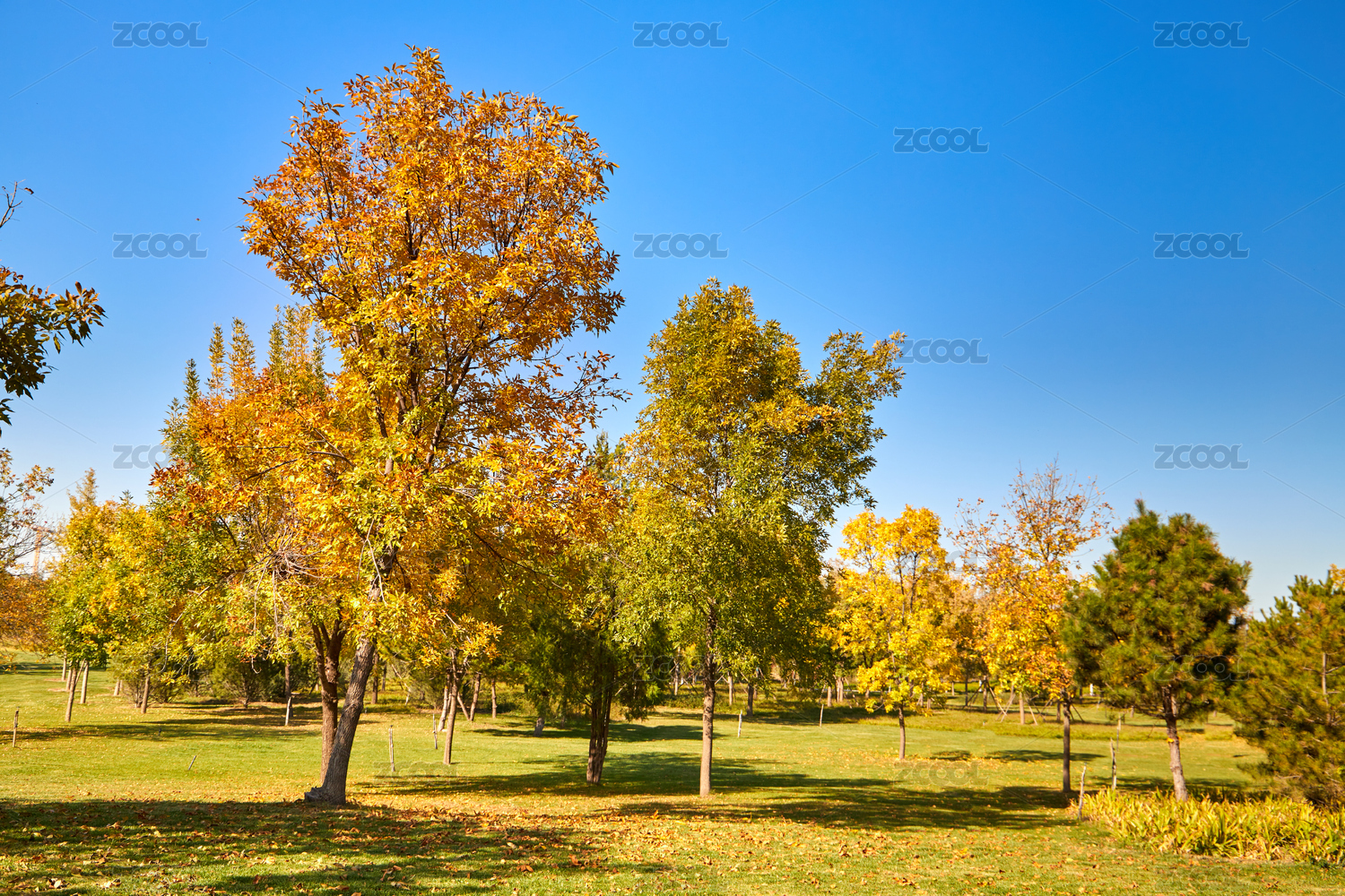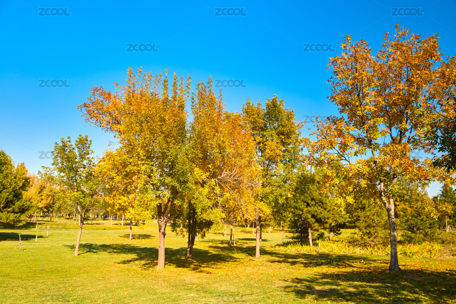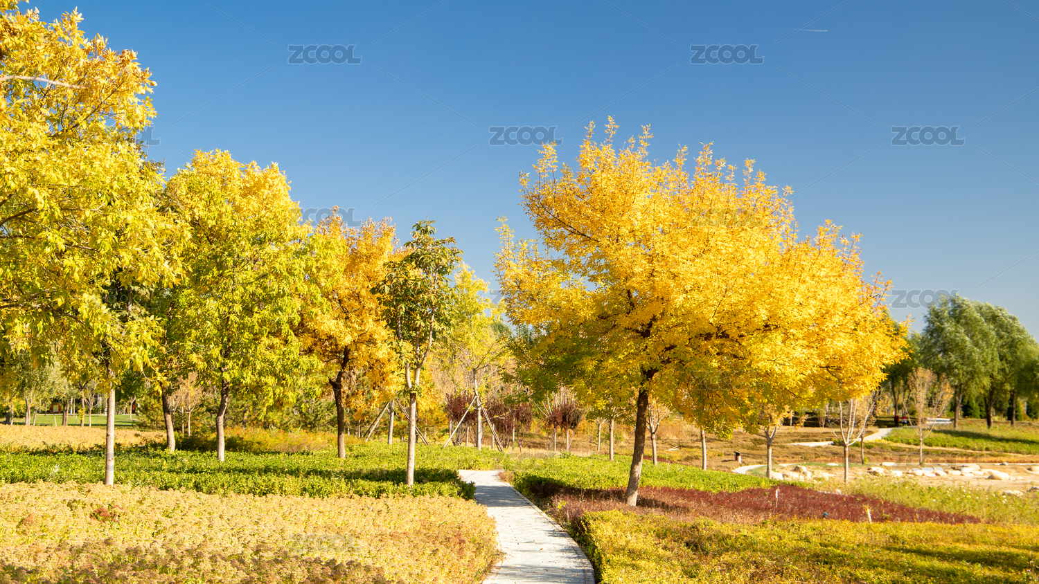 秋天北京东小口城市休闲公园里的金黄色树木