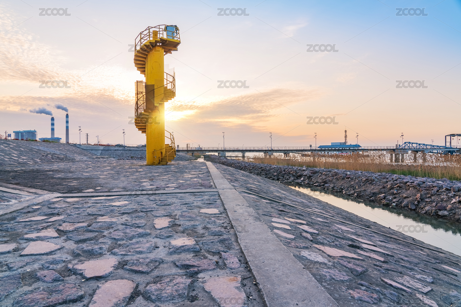 中国江苏省长江防汛堤坝和水上交通瞭望塔