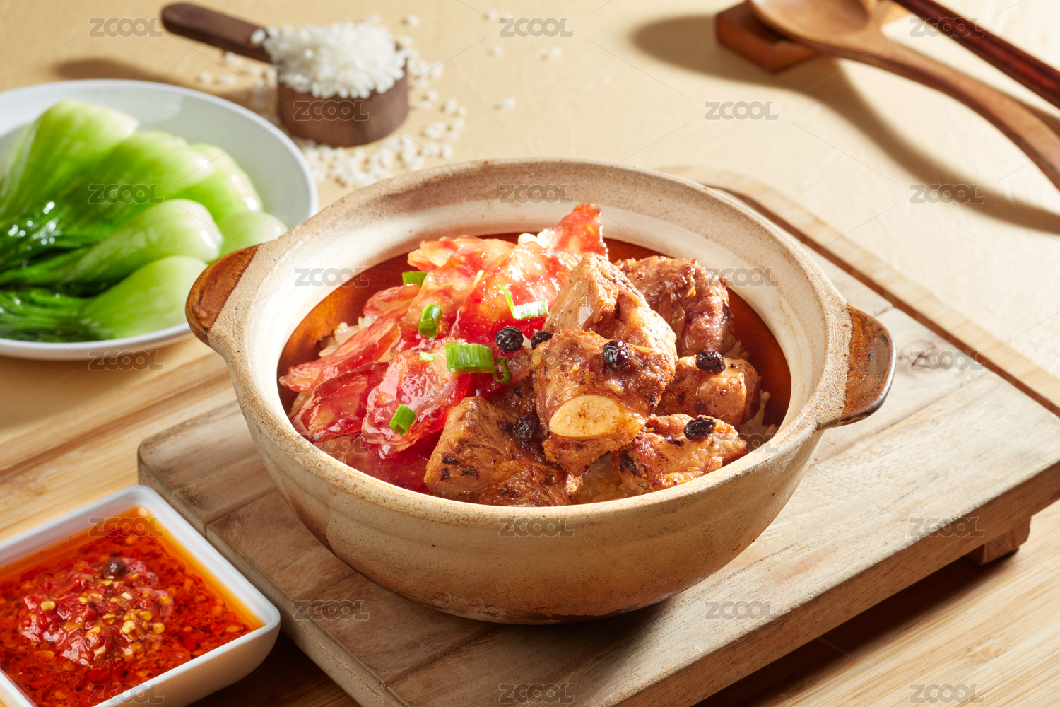 棕色木纹桌上放着一碗香肠排骨煲仔饭