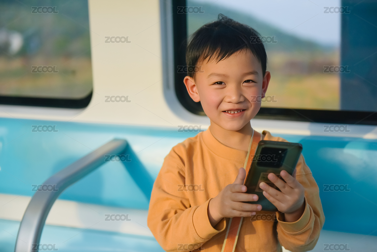 一位笑容灿烂的中国男孩正在轻轨上玩手机
