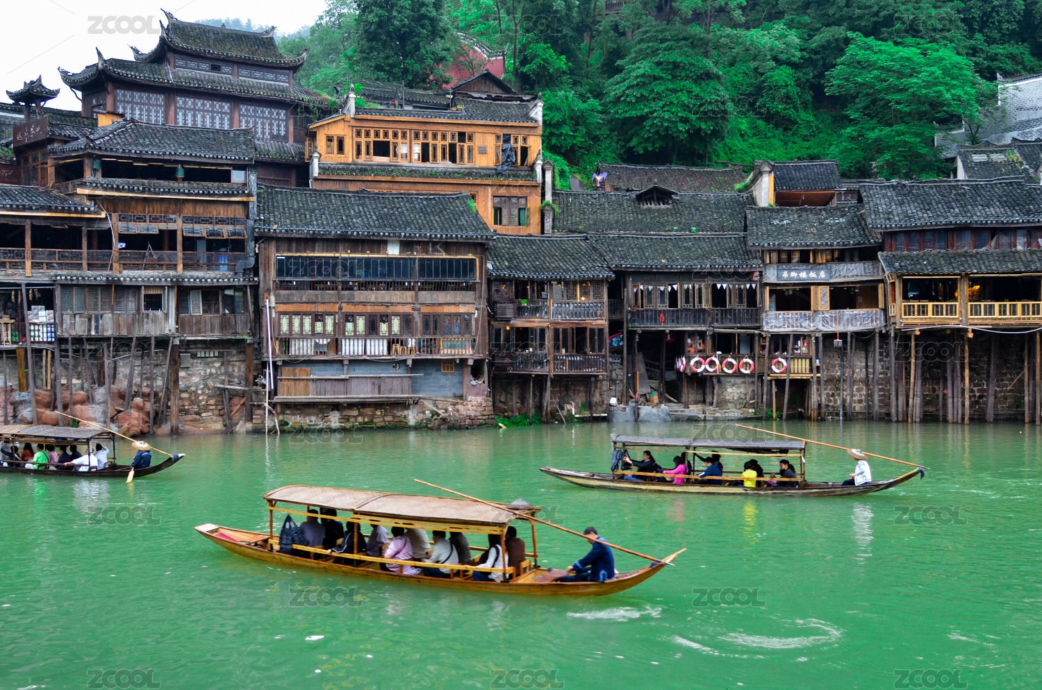 中国 湖南 湘西 凤凰古城 少数民族 土家族 苗族 吊脚楼 白天 游船 青山绿水