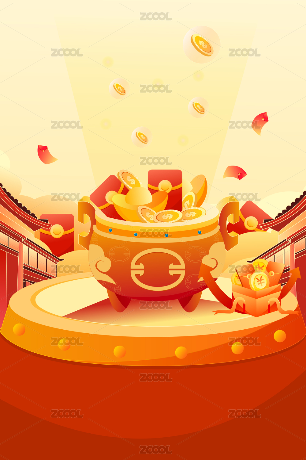 国潮矢量中国风装满元宝金币珍珠玛瑙聚宝盆