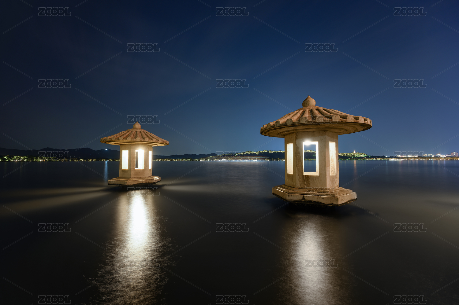 中国浙江杭州西湖翠光亭石灯亭夜景