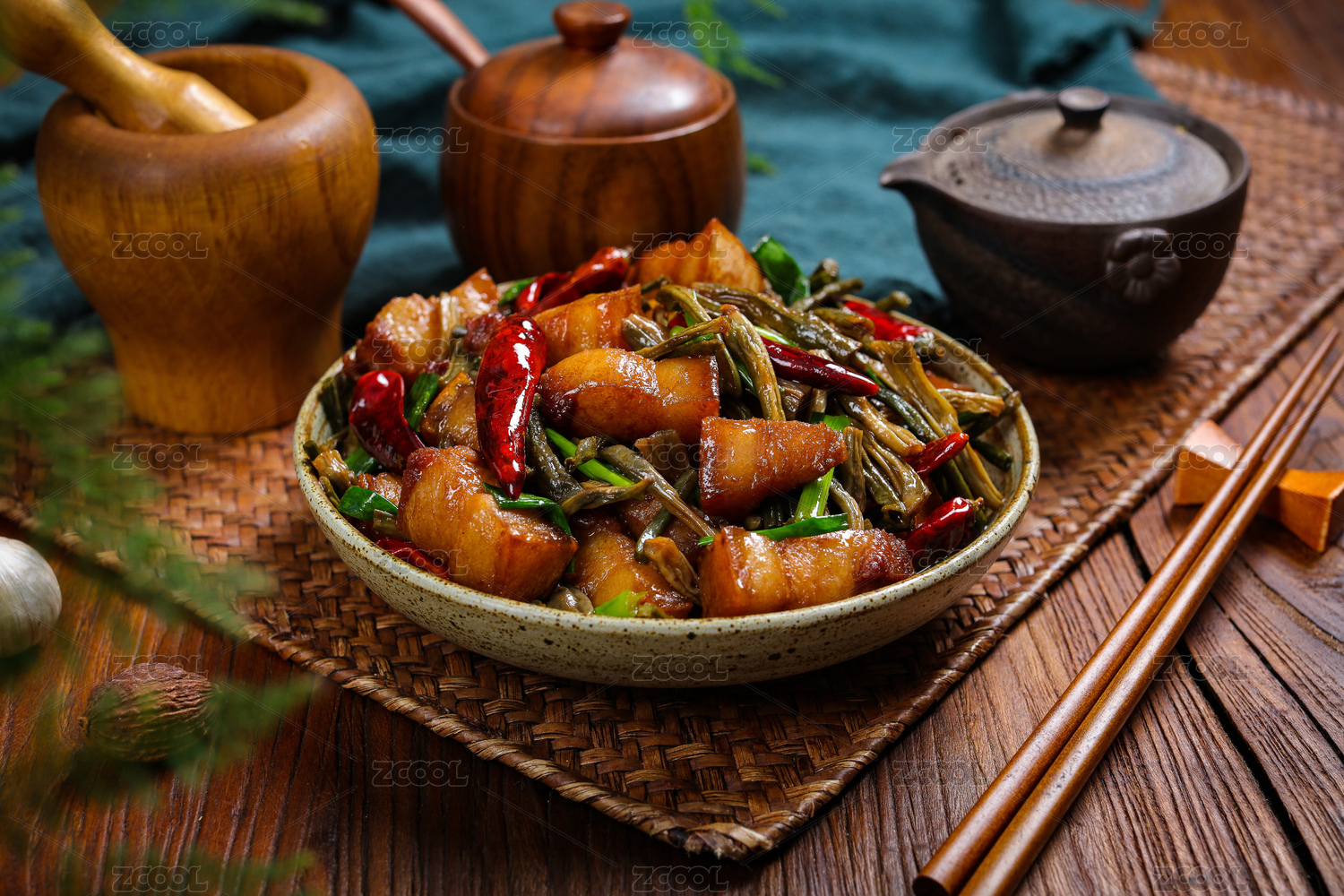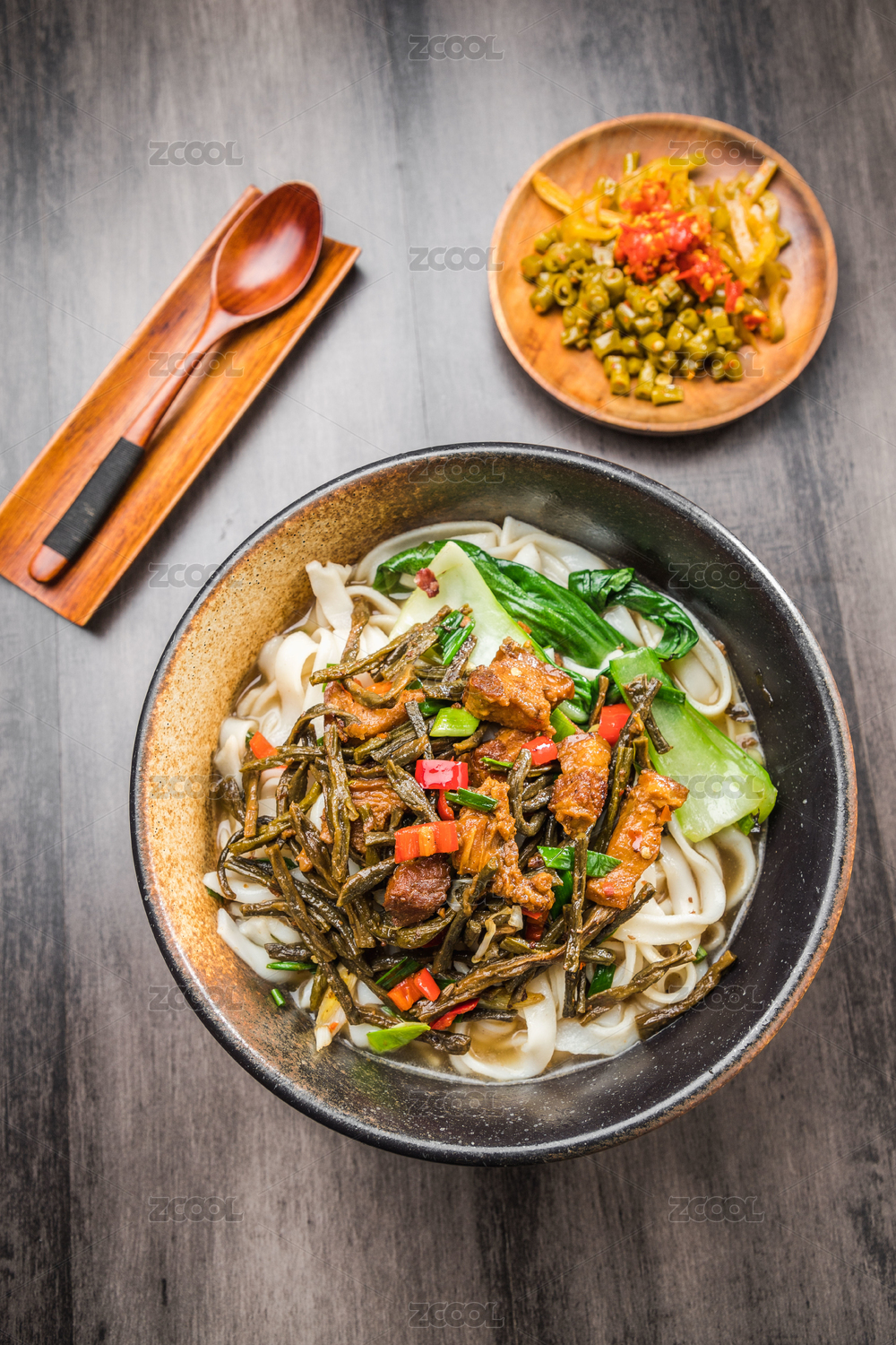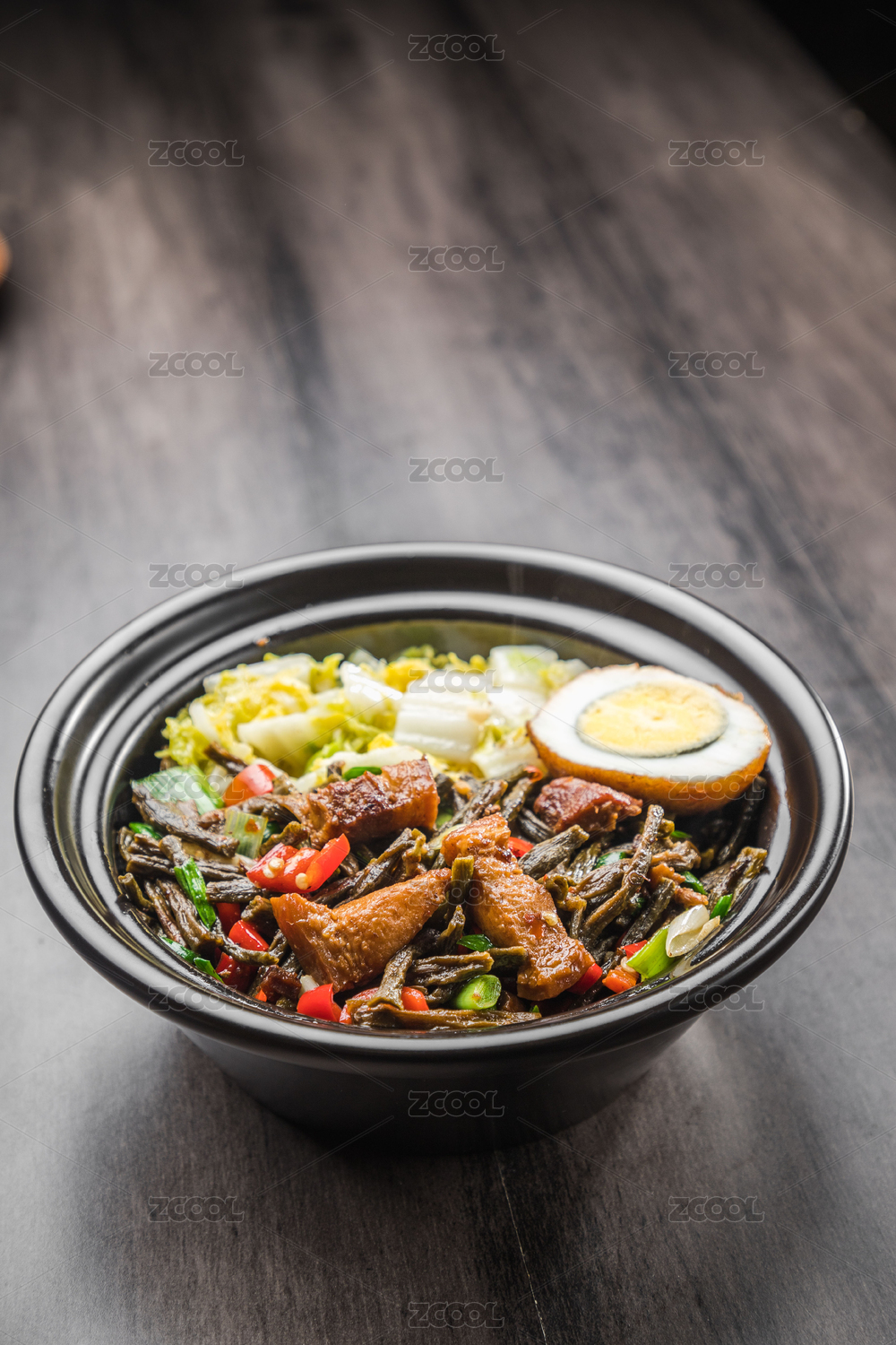 暗色木纹卓上放着一碗猪肉炖豆角米粉