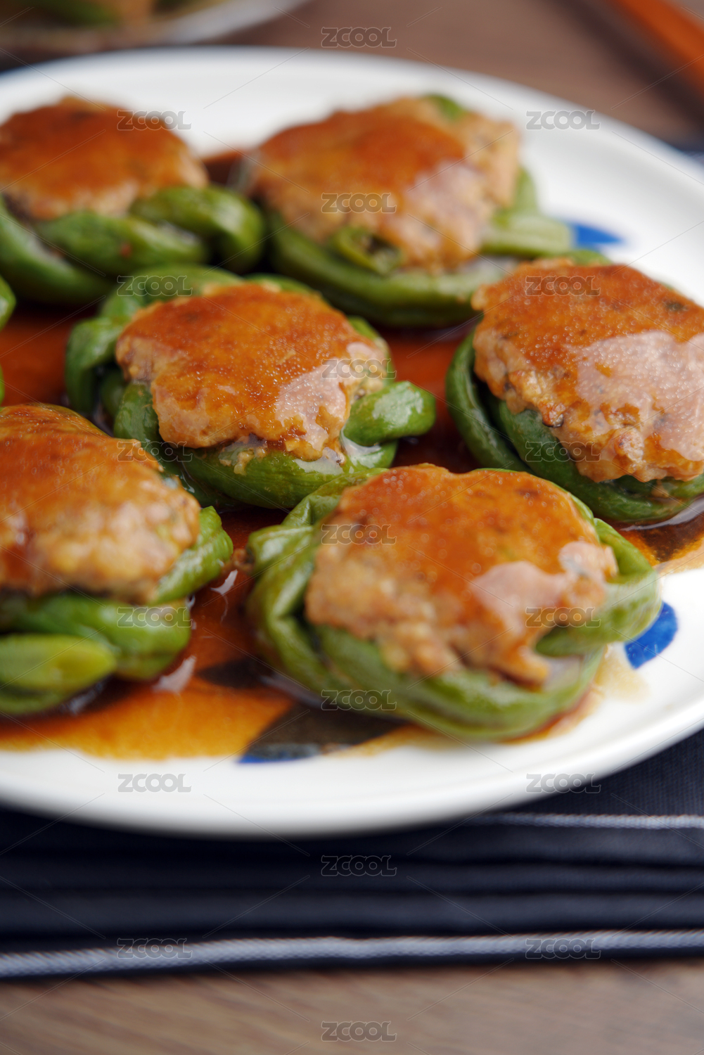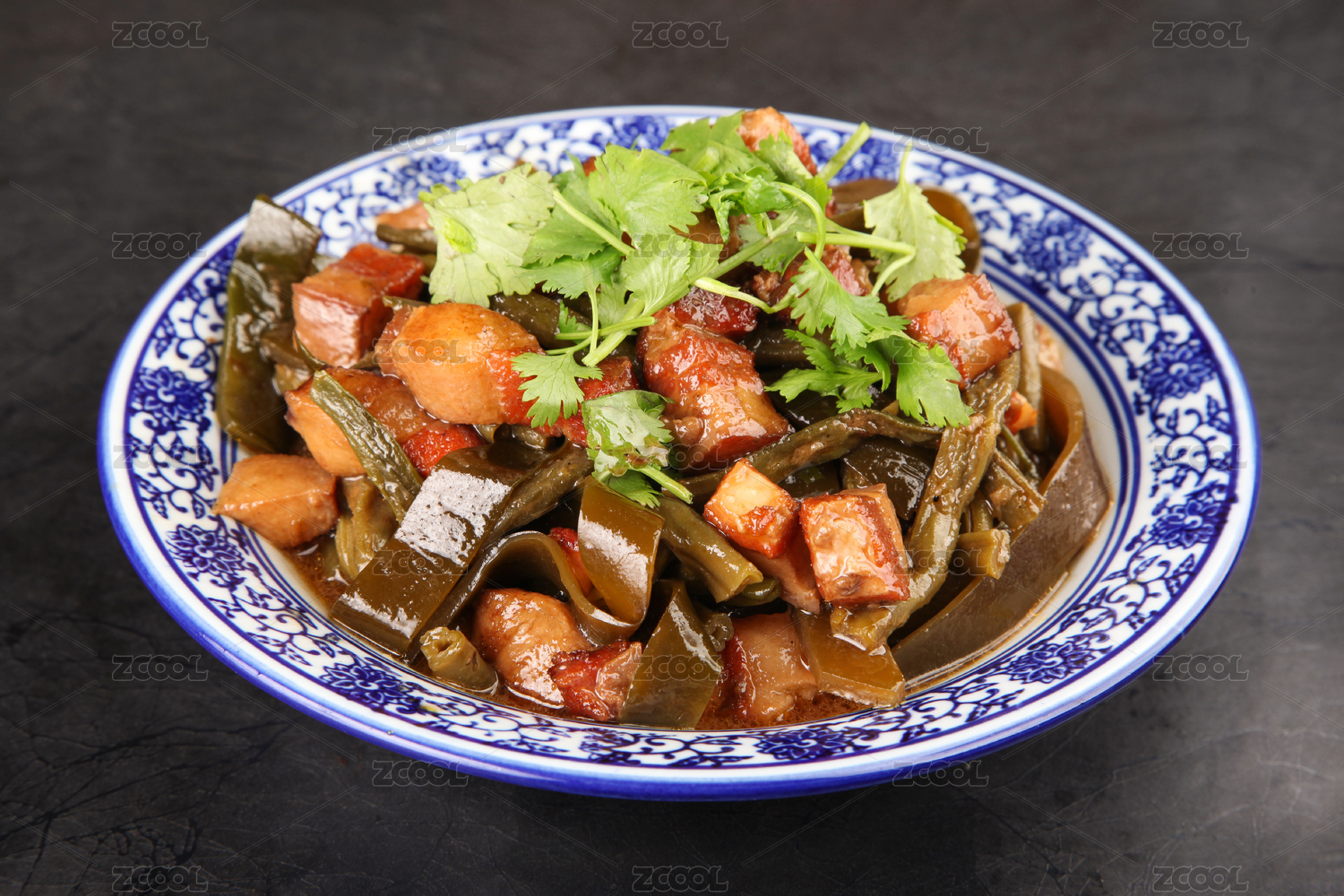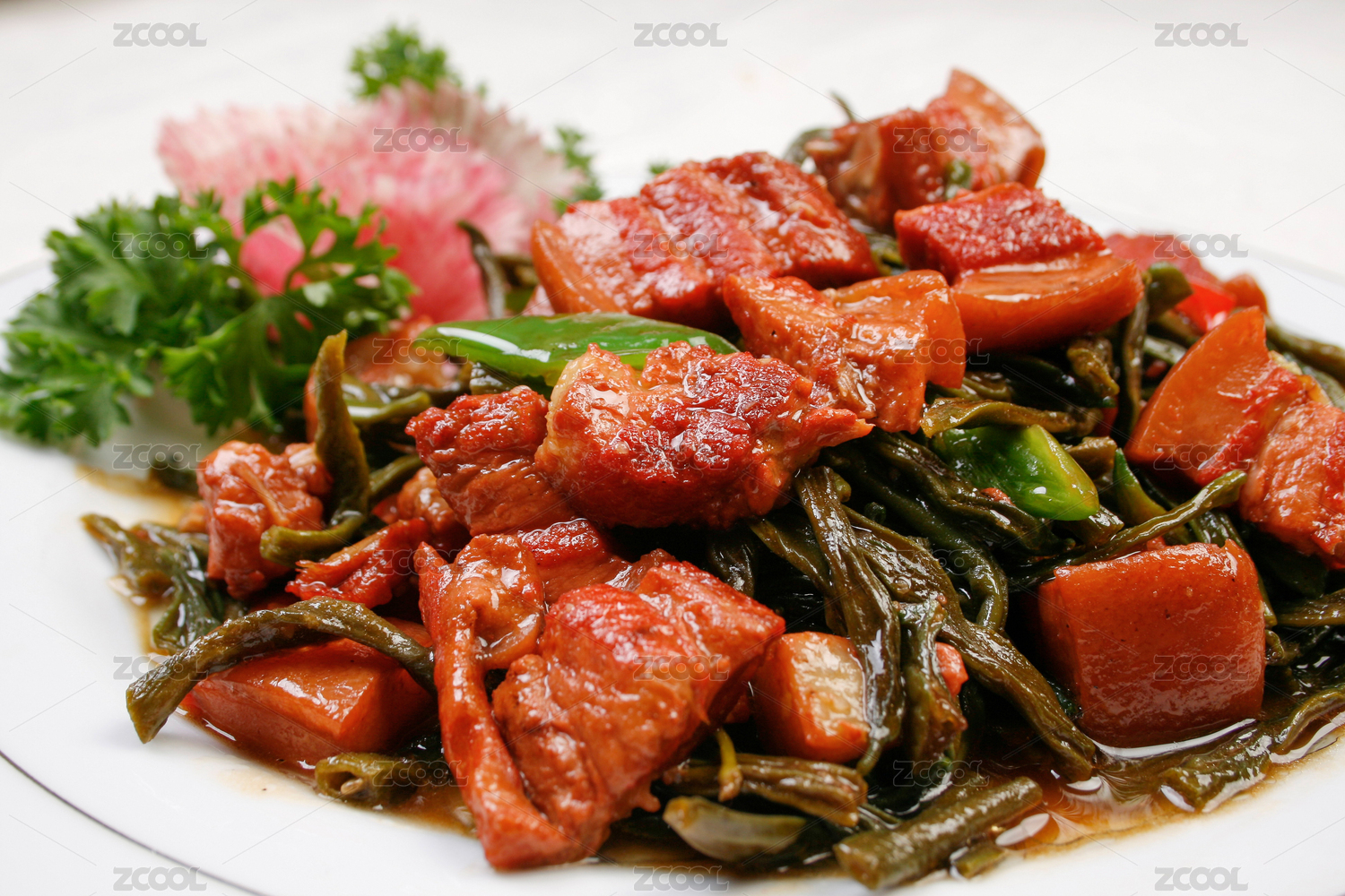 暗色木纹卓上放着一碗猪肉炖豆角米粉
