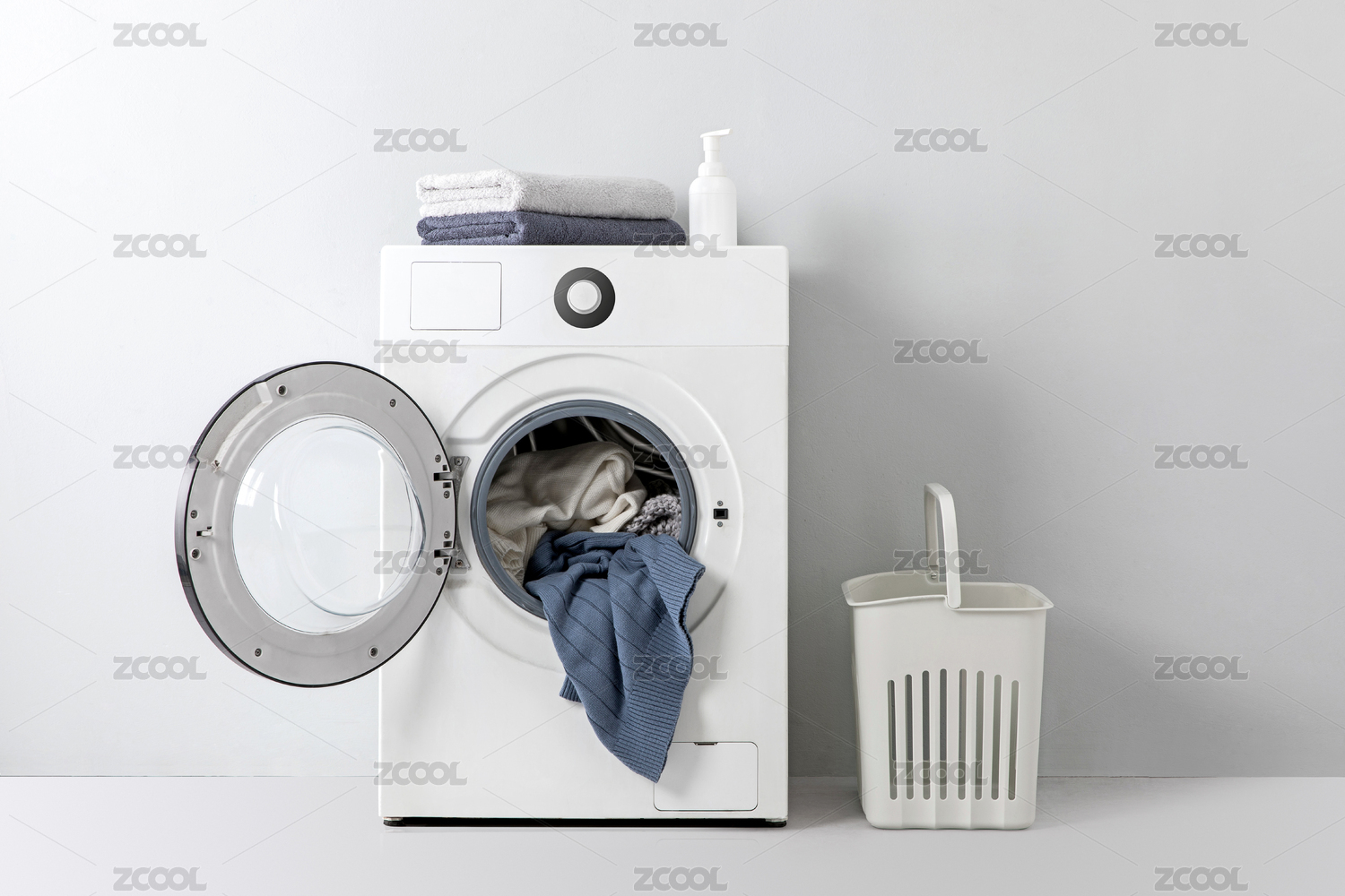 打开门的洗衣机塞满了要准备清洗的衣物