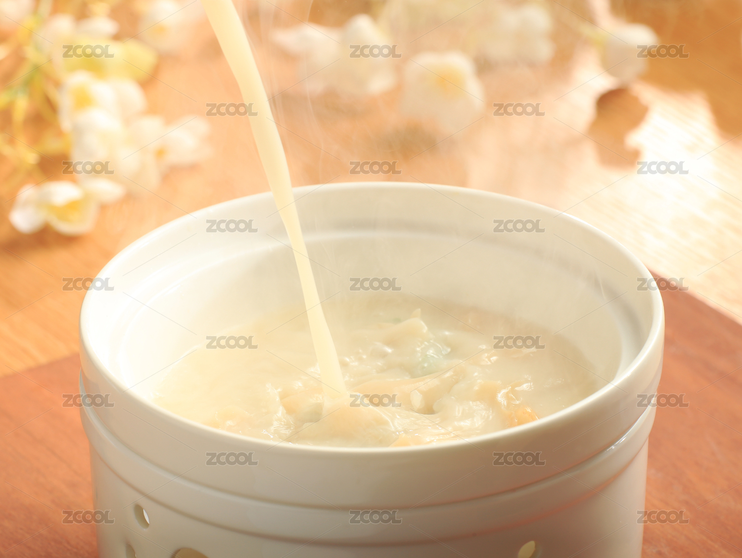 木板上白瓷器皿中的冒着热气的冲浪蚌仔,背景上放着一些白色花瓣