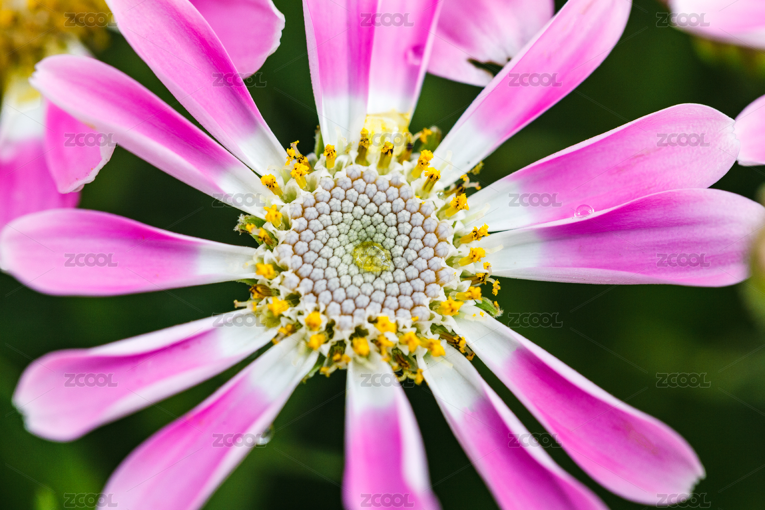 绿色背景粉白色花瓣金色花粉的雏菊正面特写