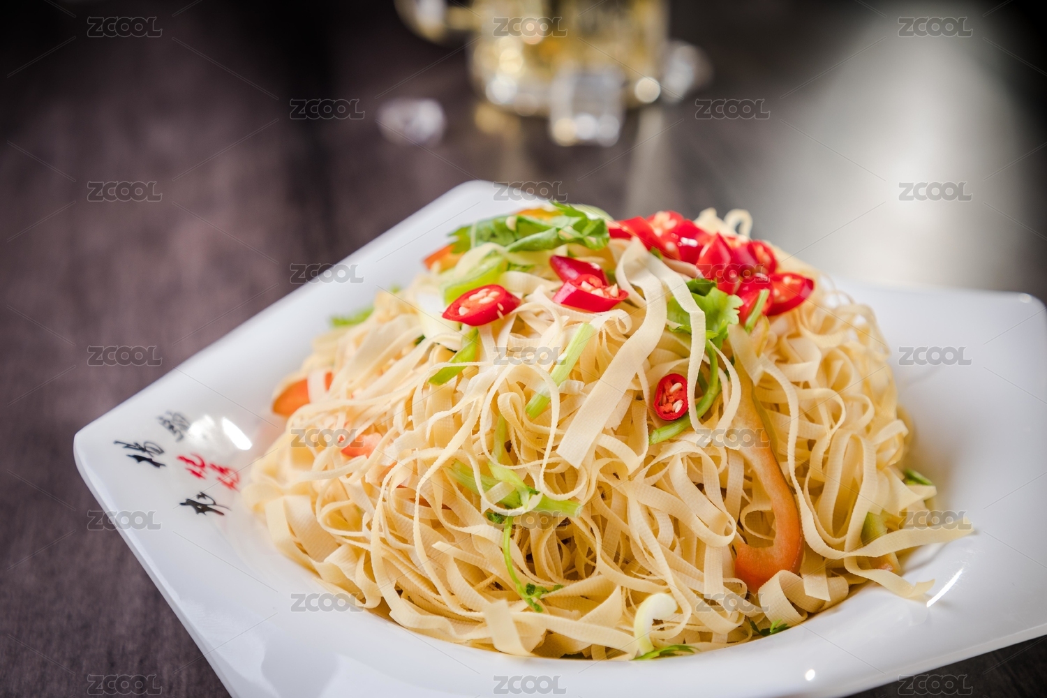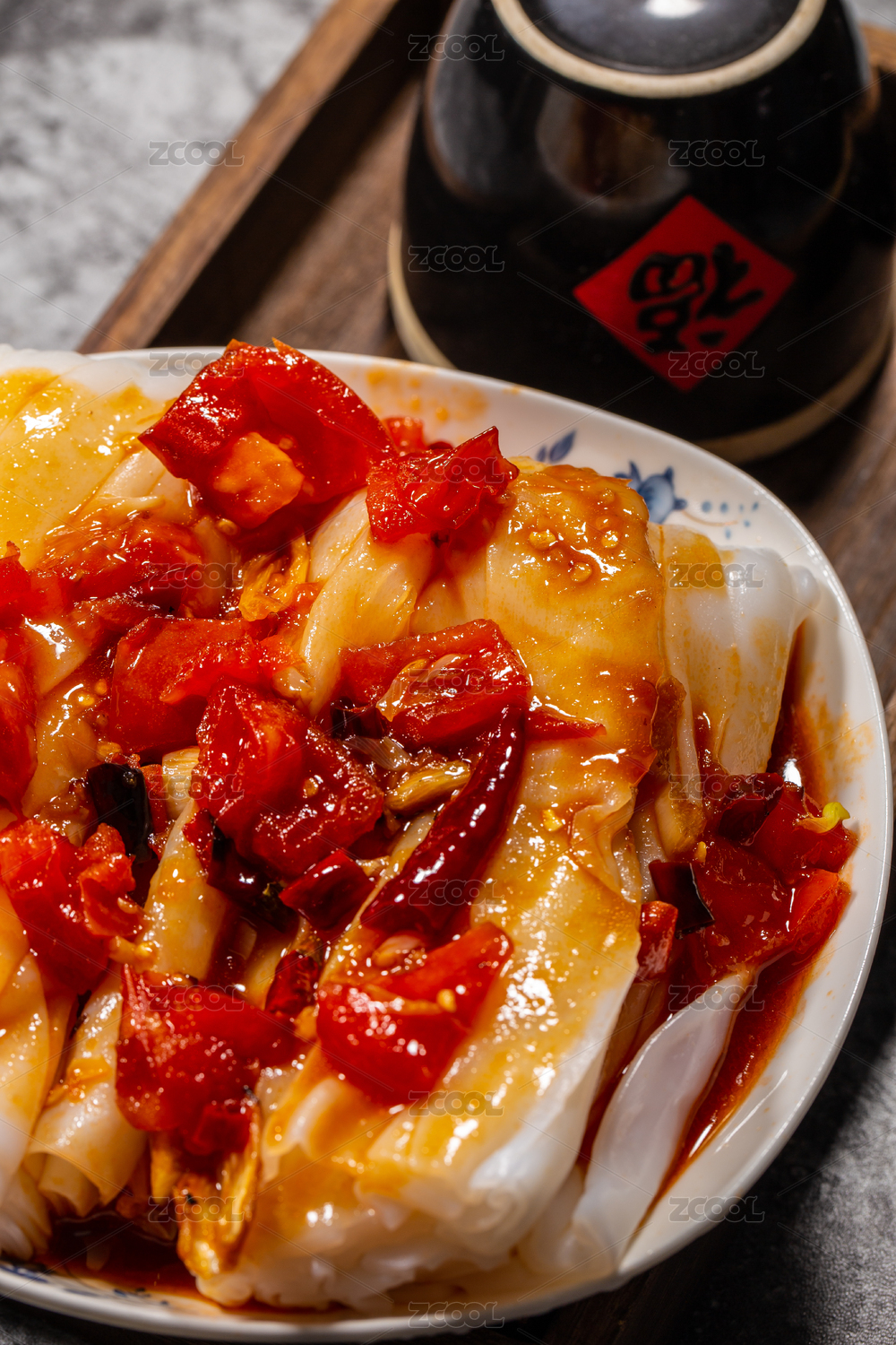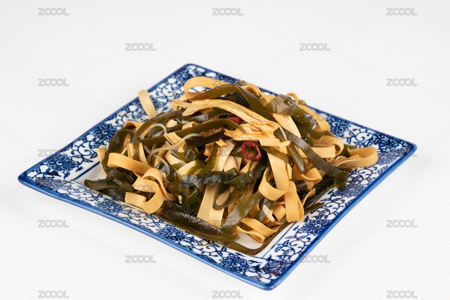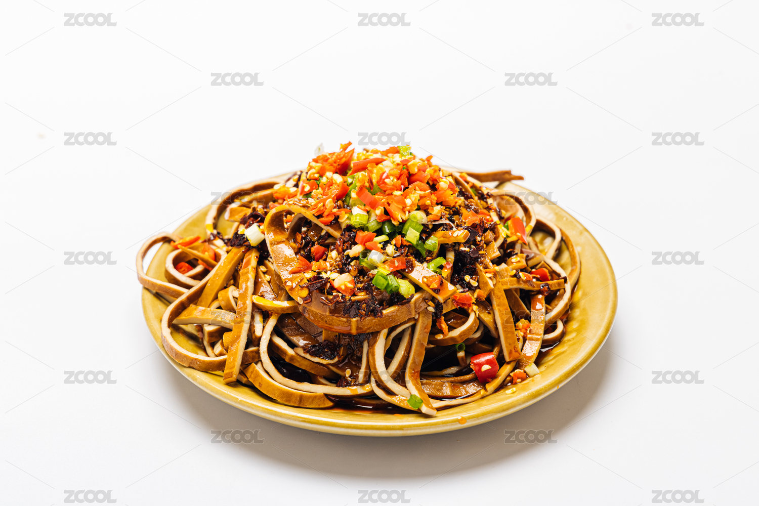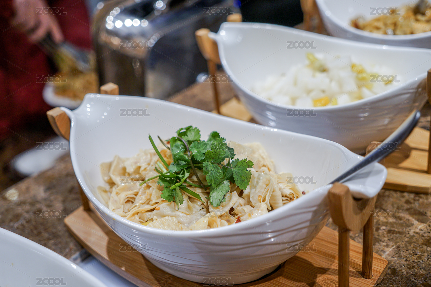 自助餐厅里美味的凉拌豆皮盛放在白瓷盘内