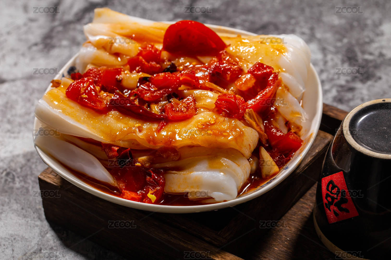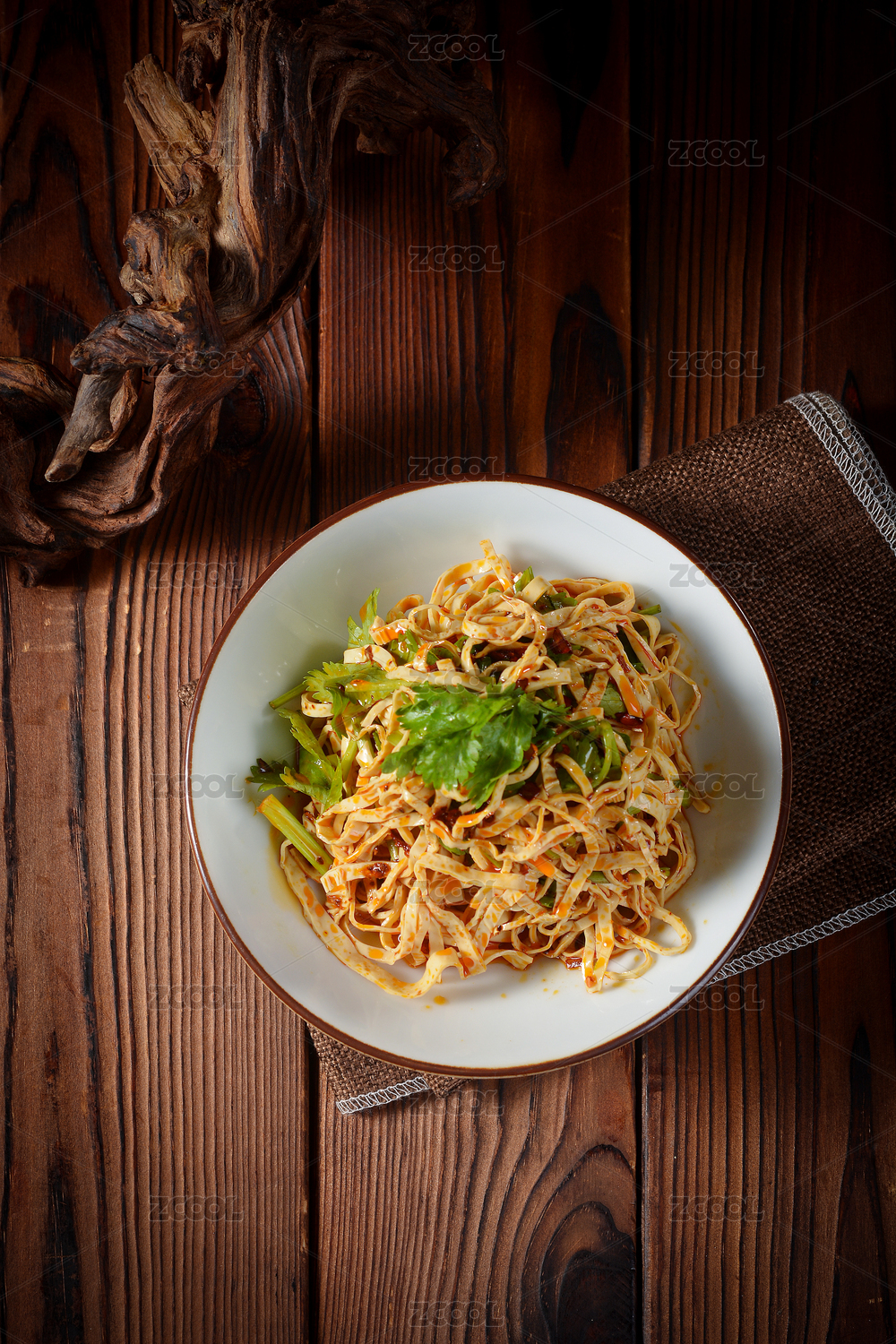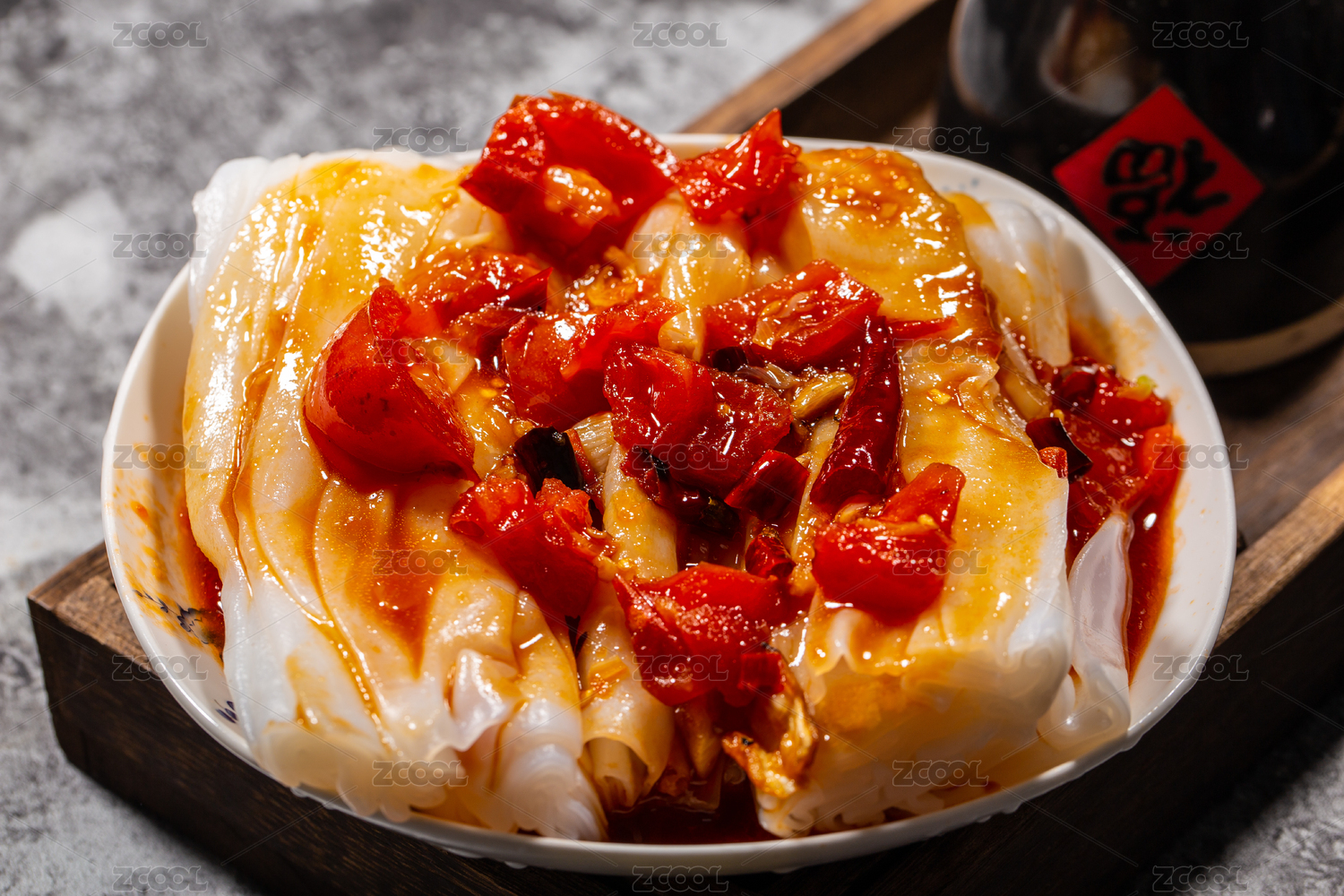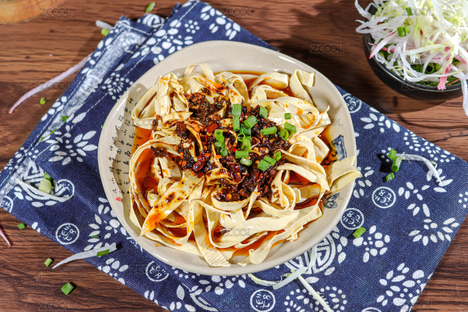 自助餐厅里美味的凉拌豆皮盛放在白瓷盘内