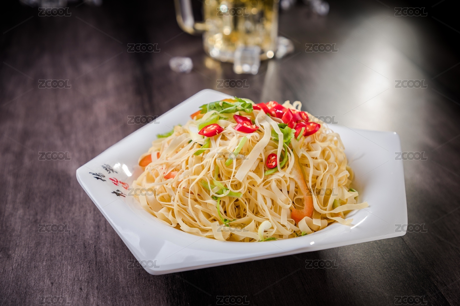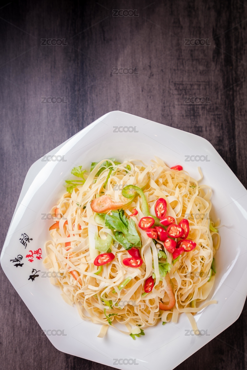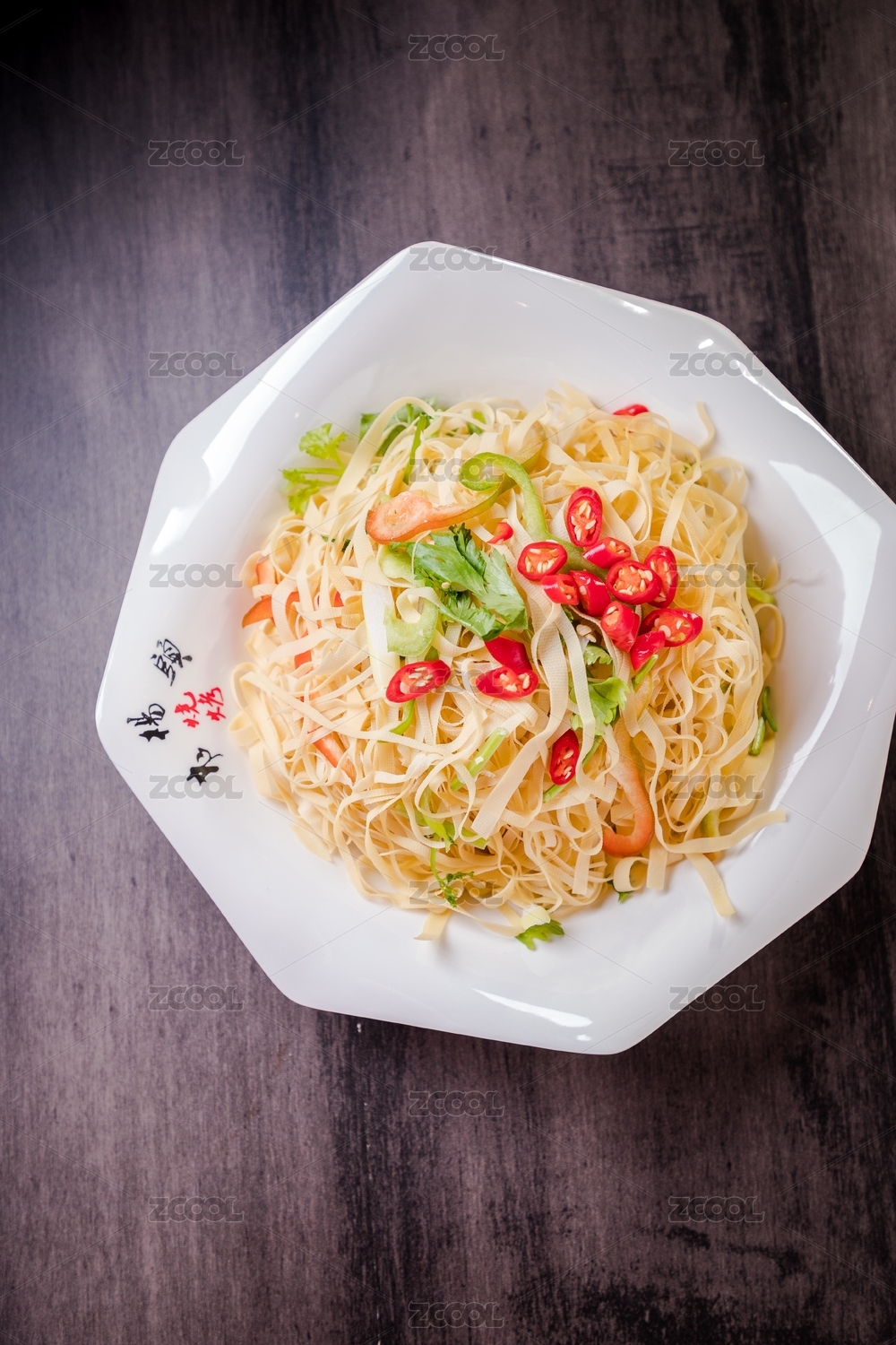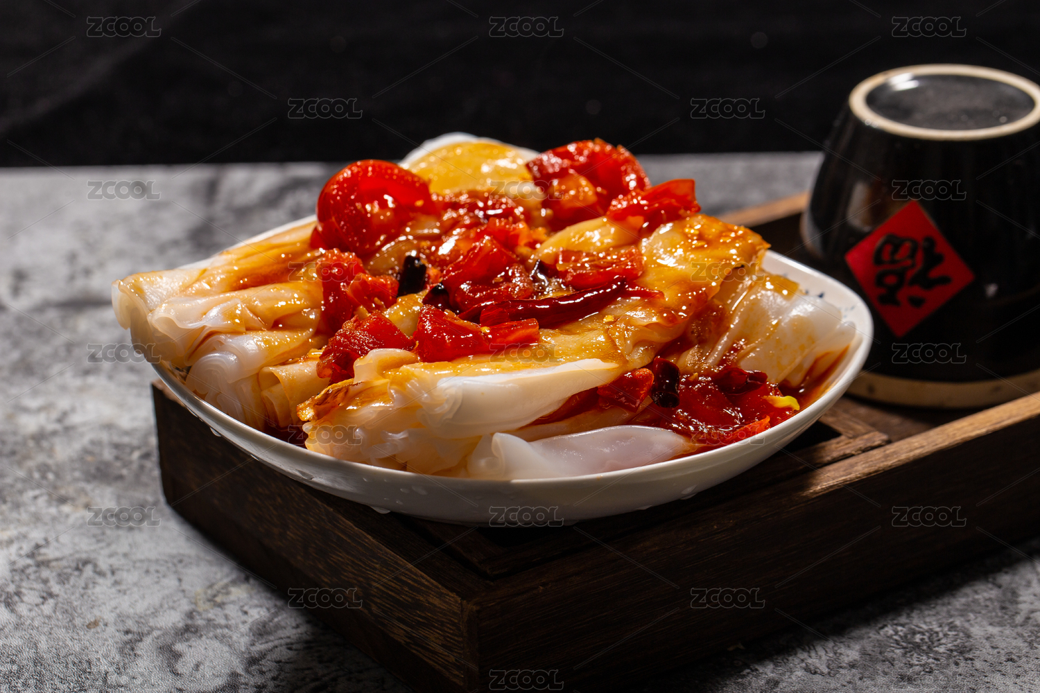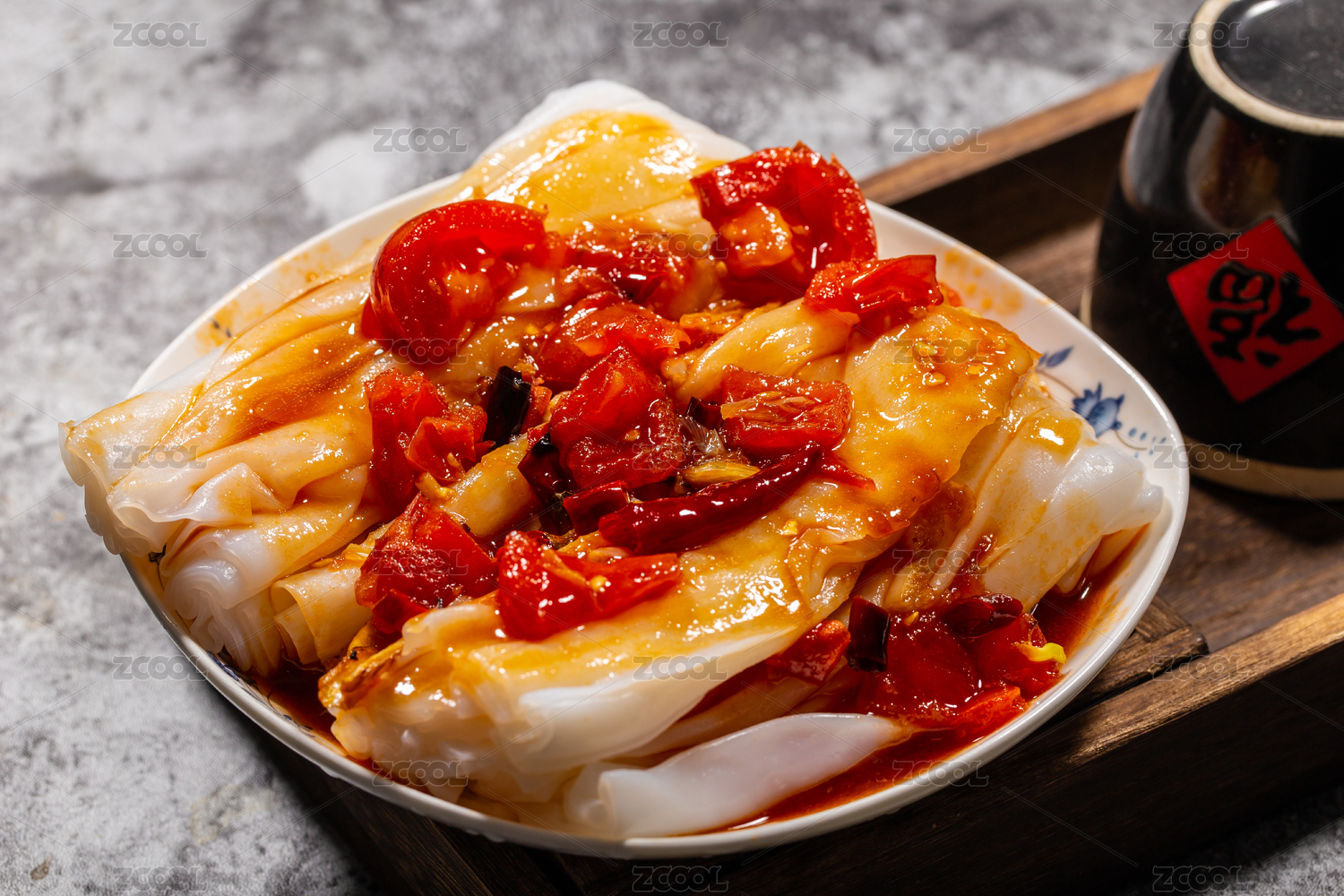 自助餐厅里美味的凉拌豆皮盛放在白瓷盘内