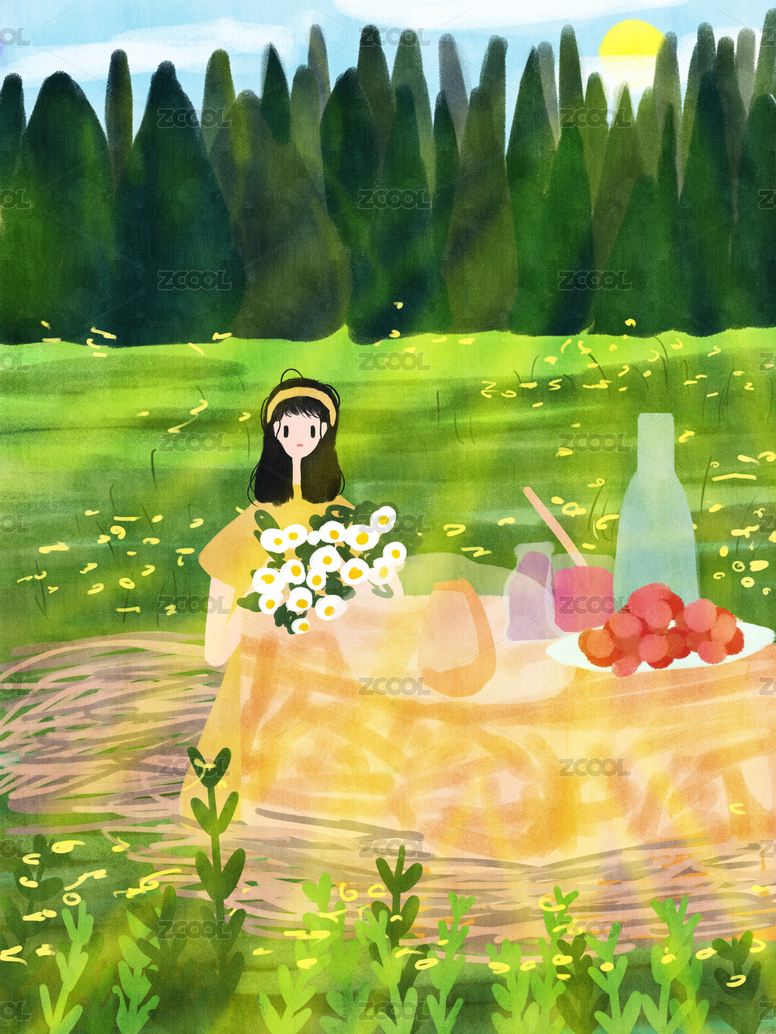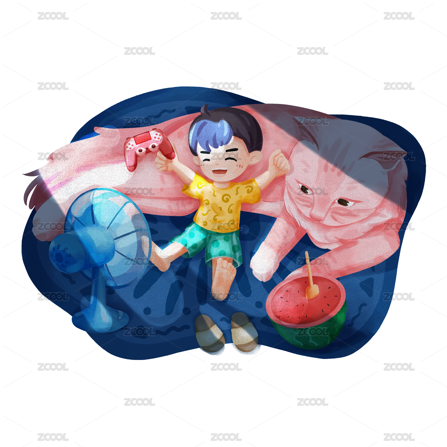 夏天户外好朋友野营吃西瓜暑假郊外避暑插画