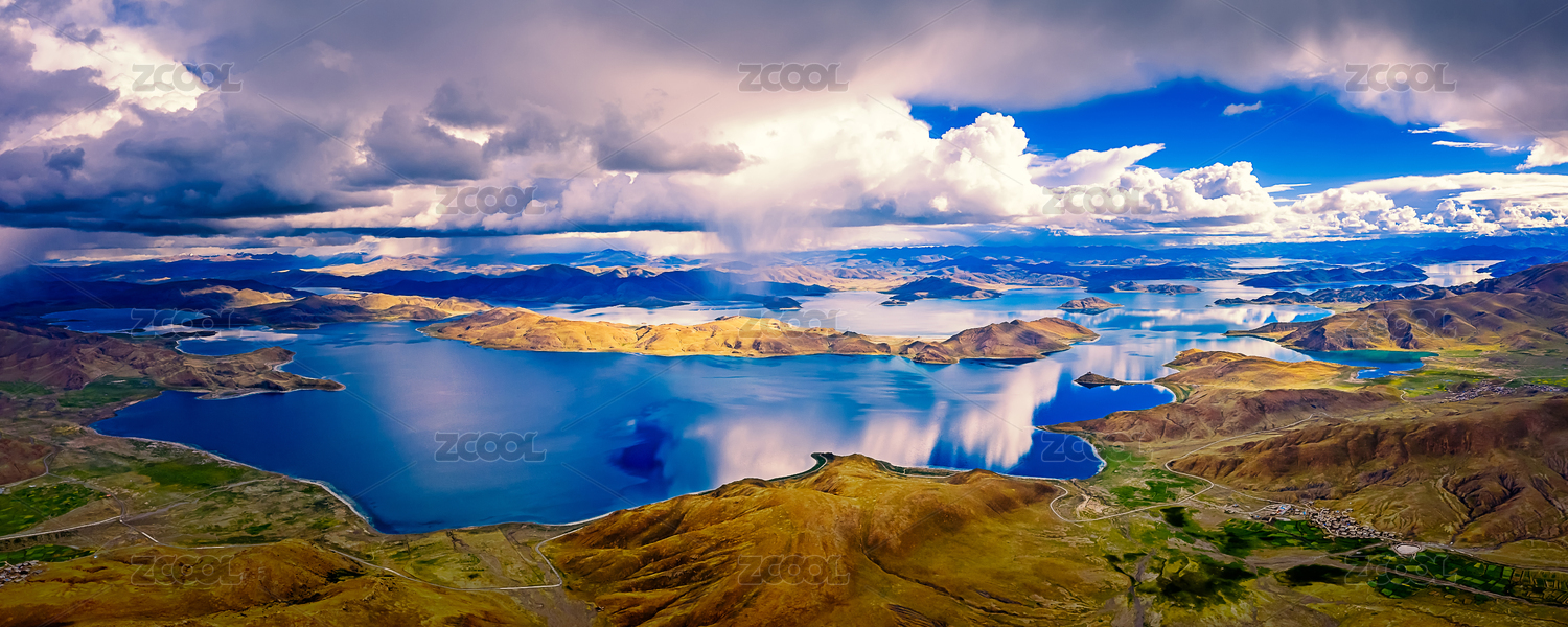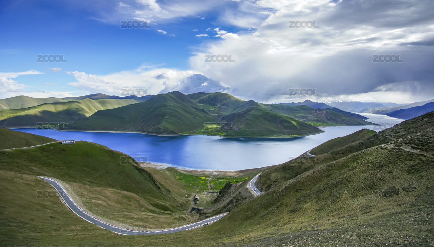中国西藏山南东边日出西边雨的羊卓雍措全景