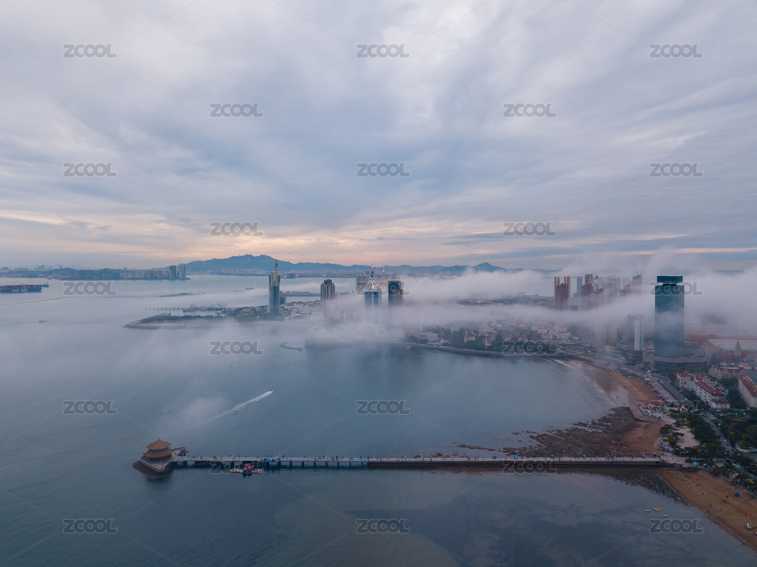 中国山东青岛栈桥平流雾航拍图