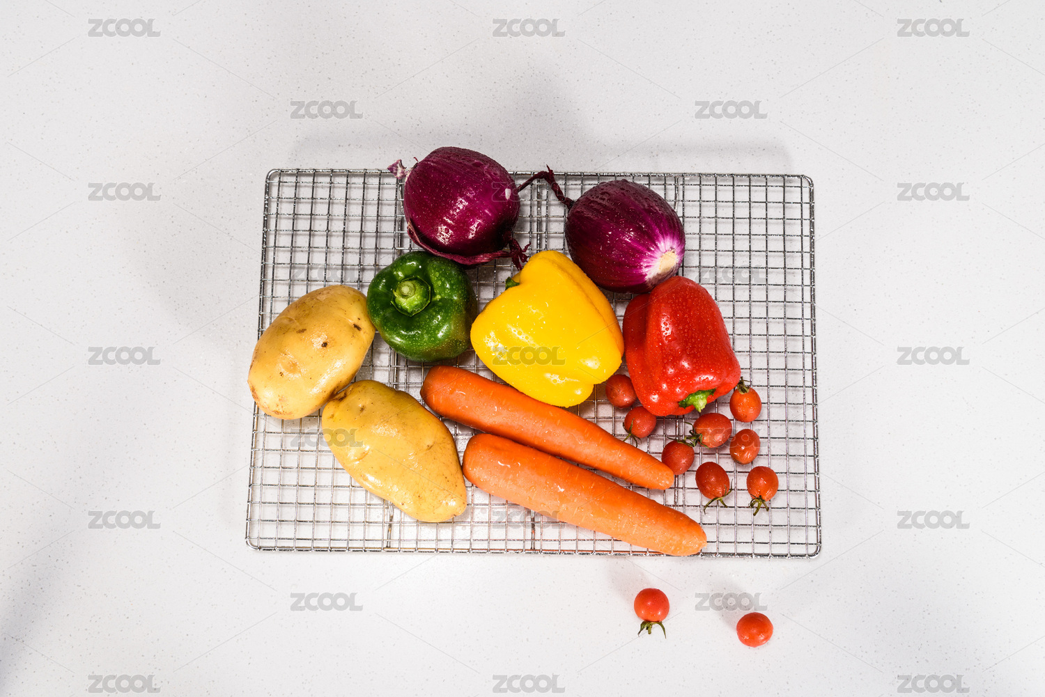 土豆灯笼椒洋葱若干果蔬放在烧烤架上