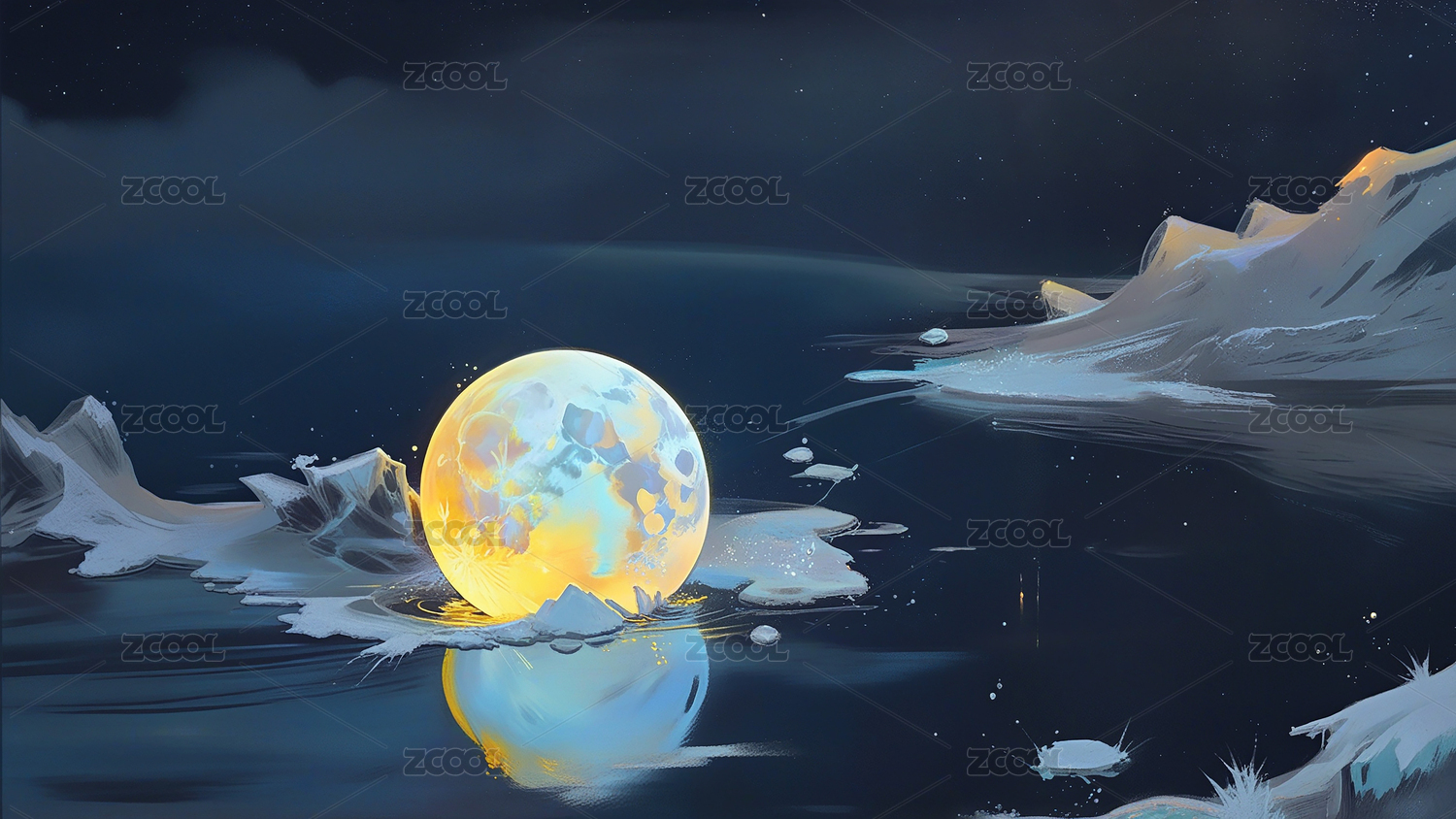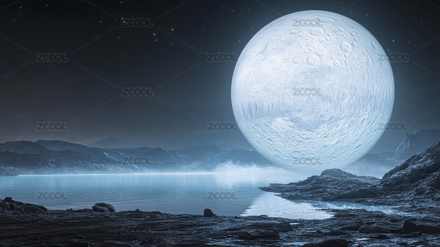 月球映衬水面星空背景下的奇幻景象