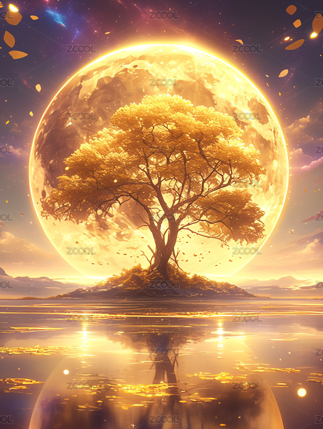 唯美浪漫月光中的金色大树与水中倒影