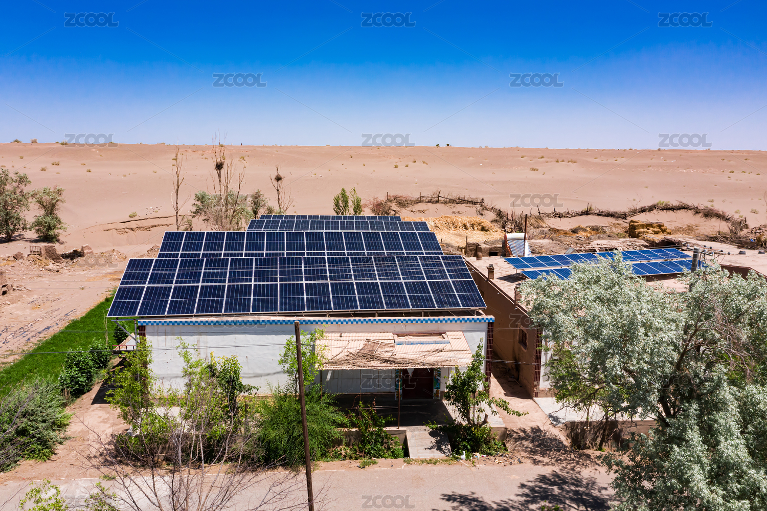 中国甘肃酒泉山村贫困户房顶太阳能发电航拍