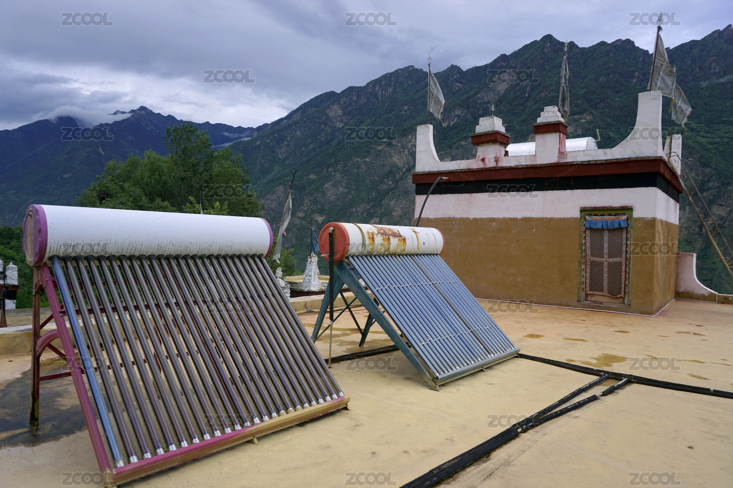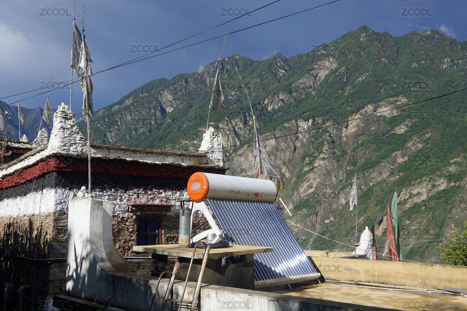 四川甘孜州丹巴甲居藏寨房顶的太阳能热水器
