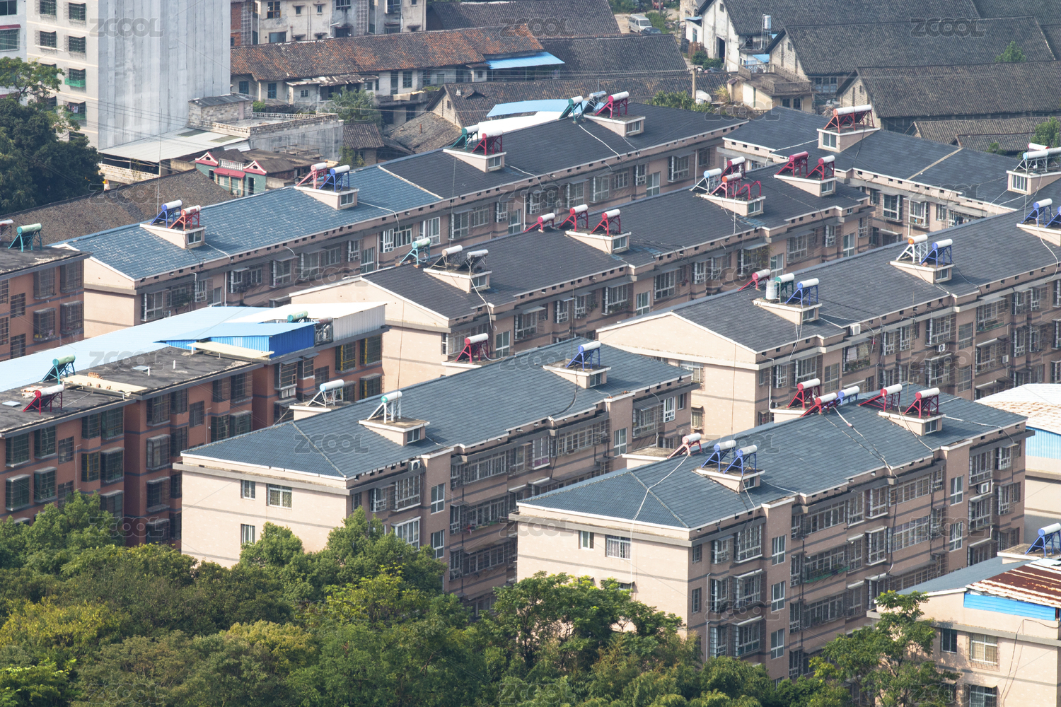 城市中人生活的现代立体居住环境房顶上装满太阳能热水器