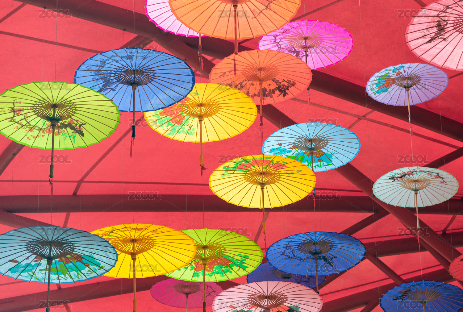 悬挂空中的五颜六色的油纸伞
