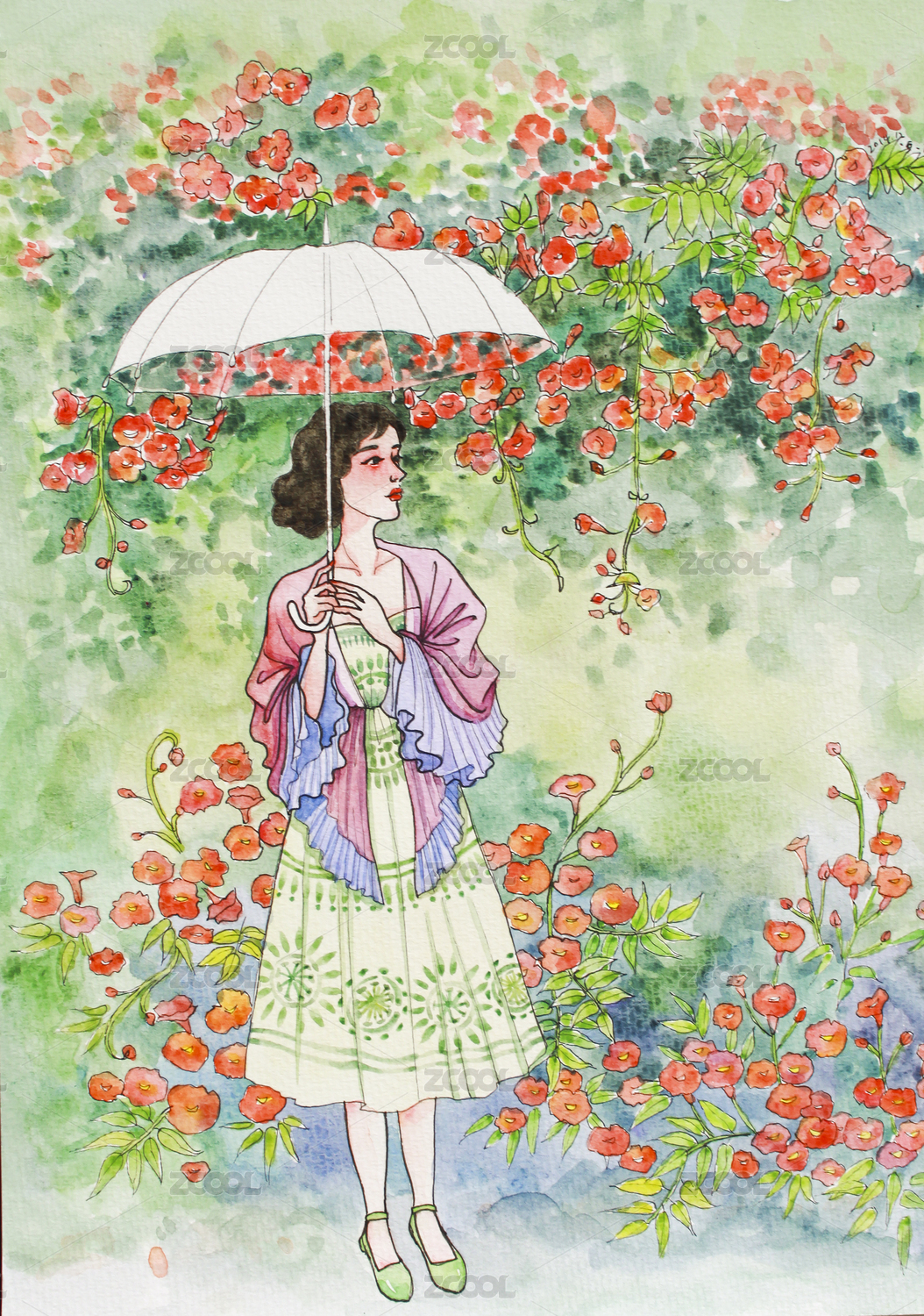 雨天花园里打伞的女孩水彩插画
