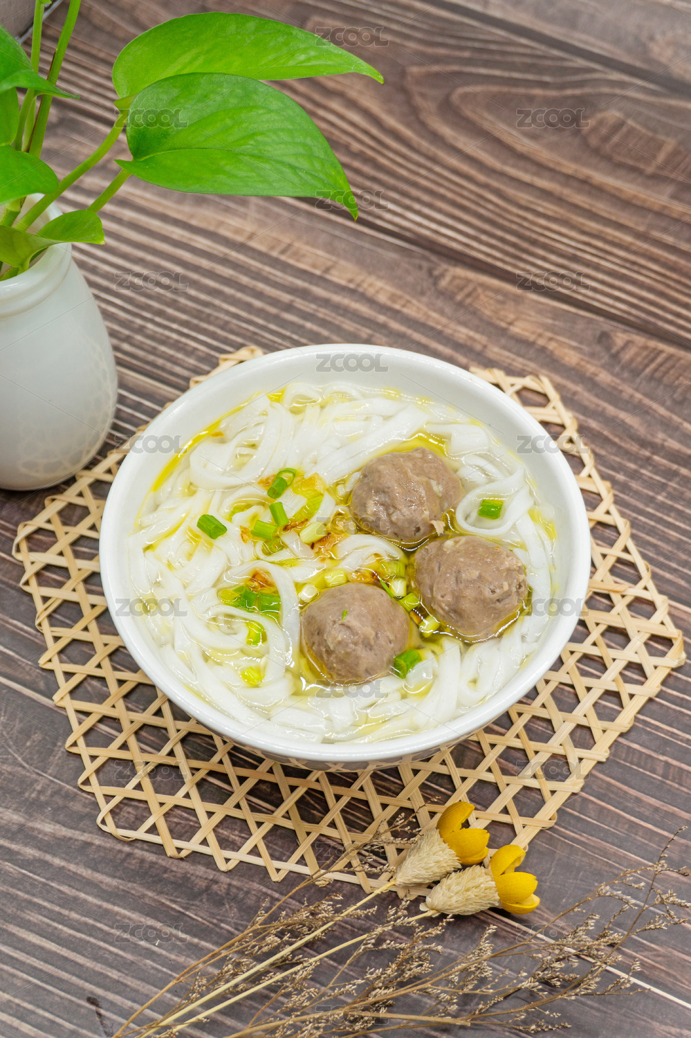 木桌背景传统潮汕牛肉丸粿条汤粉